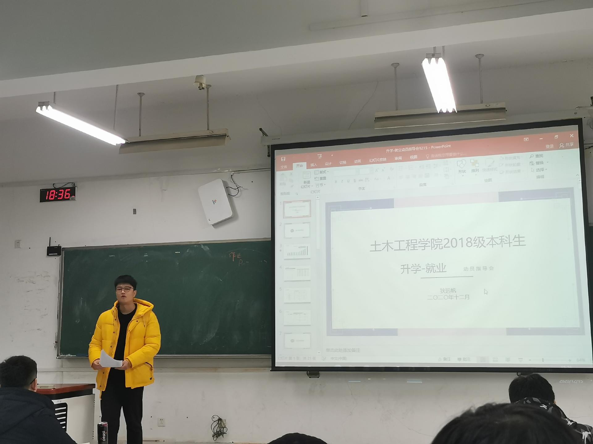为进一步加强分级分类教育,引导学生明确树立目标意识,针对性做好成长成才规划指导,12月14-15日晚,土木工程学院2018级举办两场升学-就业动员指导讲座。讲座由年级辅导员狄老师主持,全体18级同学参加了讲座。