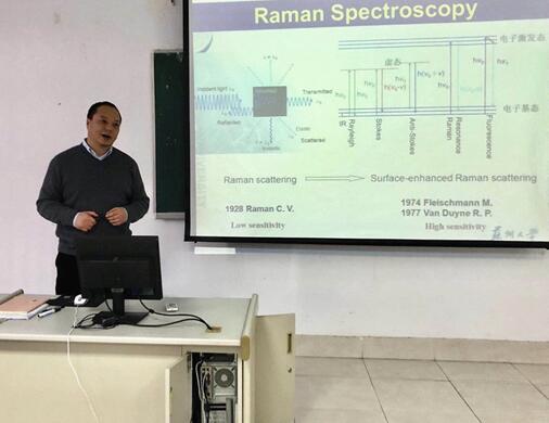1月17日下午,苏州大学材化部姚建林教授应邀来访我院,为大家做了一场题为“表面增强拉曼光谱与高灵敏度传感:策略与应用”的精彩报告。报告中,姚教授介绍了拉曼光谱及表面增强拉曼光谱,讲解了表面增强拉曼光谱基底的制备,包括大小、形状、功能、及“热点”的精准控制,又介绍了表面增强拉曼光谱应用,包括基于等离子体基元构建传感器、活体指纹残留化学物质的鉴定、表面等离激元催化表面偶联反应及监测,同时向大家介绍了相关研究成果和结论,并对拉曼光谱的应用前景进行了展望。