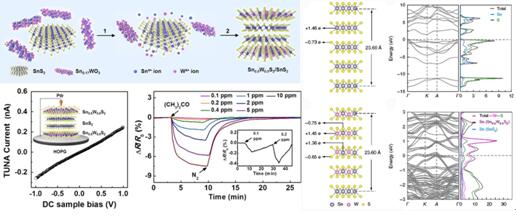 近日,万博体育bet 海外人才缓冲基地(先进材料研究院)黄维院士和黄晓教授课题组与化学与分子工程学院王强副教授课题组合作,首次通过液相法,以n型半导体1T-SnS2纳米片为模板,通过晶相和成分调控在其上下表面外延生长含有83%类1T结构的Sn0.5W0.5S2纳米片后成功制备了Sn0.5W0.5S2/SnS2垂直异质结构。理论计算表明合金化引起Sn0.5W0.5S2中Sn和W之间的电荷重新分布,使其具有金属性质。峰值力隧道电流显微镜测量进一步证实Sn0.5W0.5S2与SnS2的界面间欧姆接触的存在,这一结构显著降低了界面的接触电阻,提高了材料的光响应速度。同时,掺杂产物Sn0.5W0.5S2对丙酮分子的吸附能相较于本征SnS2提高了5倍,进而结合层状异质组分间的有效电荷传输,使得基于Sn0.5W0.5S2/SnS2异质结的丙酮气体传感器噪音仅为传统SnS2传感器的1/35,室温下100 ppb的响应值远优于众多同类传感器件。
