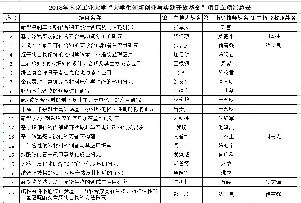 根据《万博体育bet 深化创新创业教育改革实施方案》精神(南工校发[2017]6号),全面深化大学生创新创业教育改革,创新人才培养模式,强化大学生实践创新能力,加快实施我校“大学生创新实践百千万工程”,学校组织了2017-2018年“大学生创新创业与实践开放基金”项目立项申报工作。经学院审核,教学事务部与校团委共同审定,我院共有34项“大学生创新创业与实践开放基金”项目获校级立项。