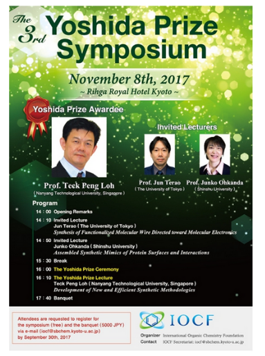 日前,万博体育bet 化学与分子工程学院、先进化学制造研究院罗德平教授受邀参加日本第三届吉田赏研讨会(Yoshida Prize Symposium)暨颁奖典礼。Yoshida Prize是由国际有机化学财团(International Organic Chemistry Foundation, IOCF)支持,以Yoshida教授命名的奖项,旨在奖励在有机化学领域作出杰出贡献的亚洲化学家。此外,Yoshida教授也倡导和设立了国际有机化学界著名的 International Organic Chemistry Foundation(IOCF),International Kyoto Conference on Organic Chemistry (IKCOC)等基金和奖励,目的在于支持有机化学的发展与全球有机化学家之间的交流与合作。本届Yoshida Prize Symposium将于2017年11月8日在日本京都Rihga Royal酒店举行。