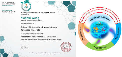 近日,我院王小辉教授当选为国际先进材料学会(InternationalAssociation of Advanced Materials, IAAM)会士(Fellow ofIAAM),以表彰他在“生物传感、生物电子与生物器件”领域所做出的突出贡献,并应邀在线作了“IAAMFellow Lecture 2021”会士报告,报告题目为“Metal-involved fluorescent and luminescent probes for anti-Alzheimer’s disease”,着重介绍了其课题组近年来在金属介导的荧光和镧系发光探针用于抗阿尔茨海默病方面所做的系统工作。