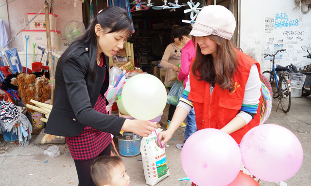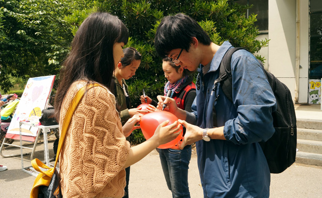 上午8点,全体人员在校门口全数集合,活动正式开始。本次主题活动共分为两个部分。首先,由青协部员在学校内收集各级学生们对他人的关爱物语,并将它们写在气球上;其次,由青协部员将这些温暖的祝福分发给社会各界的人民群众,代表我校用积极行动去温暖他人。部员共分为两组,一组去浦口区苏果购物中心,另一组则到浦口区蔬菜批发超市。活动气氛分外高涨,广大市民也积极参与其中,人们在欢声笑语中感受彼此最真挚的祝愿。同时我院青协巧遇南审青协举办雅安慈善捐款活动,在彼此合影留念中共同感受同学们的情真意切。