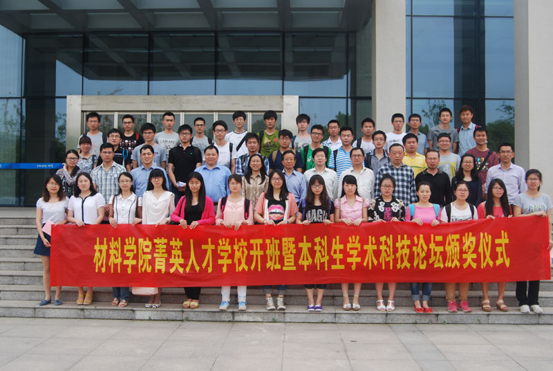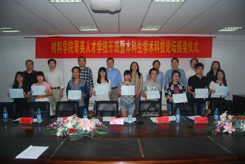 教授宣读了材料学院第九届本科生论坛表彰的决定以及2013年本科生课外学术科技创新实践课题结题通知,然后,由列席的各位教授先后为本科生论坛学生代表、结题同学颁奖和颁发结题通知书。 随后,材料学院党委副书记考宏涛老师宣读了菁英人才学校第三期学员和指导教师名单、2014年本科生课外学术创新实践课题立项通知,并为各位指导老师颁发了聘书,为学生颁发了立项通知书。 仪式上,戚燕俐同学代表第三期学员发言,她认真地分享了自己这一年在菁英班的心得与收获,并且诚挚地感