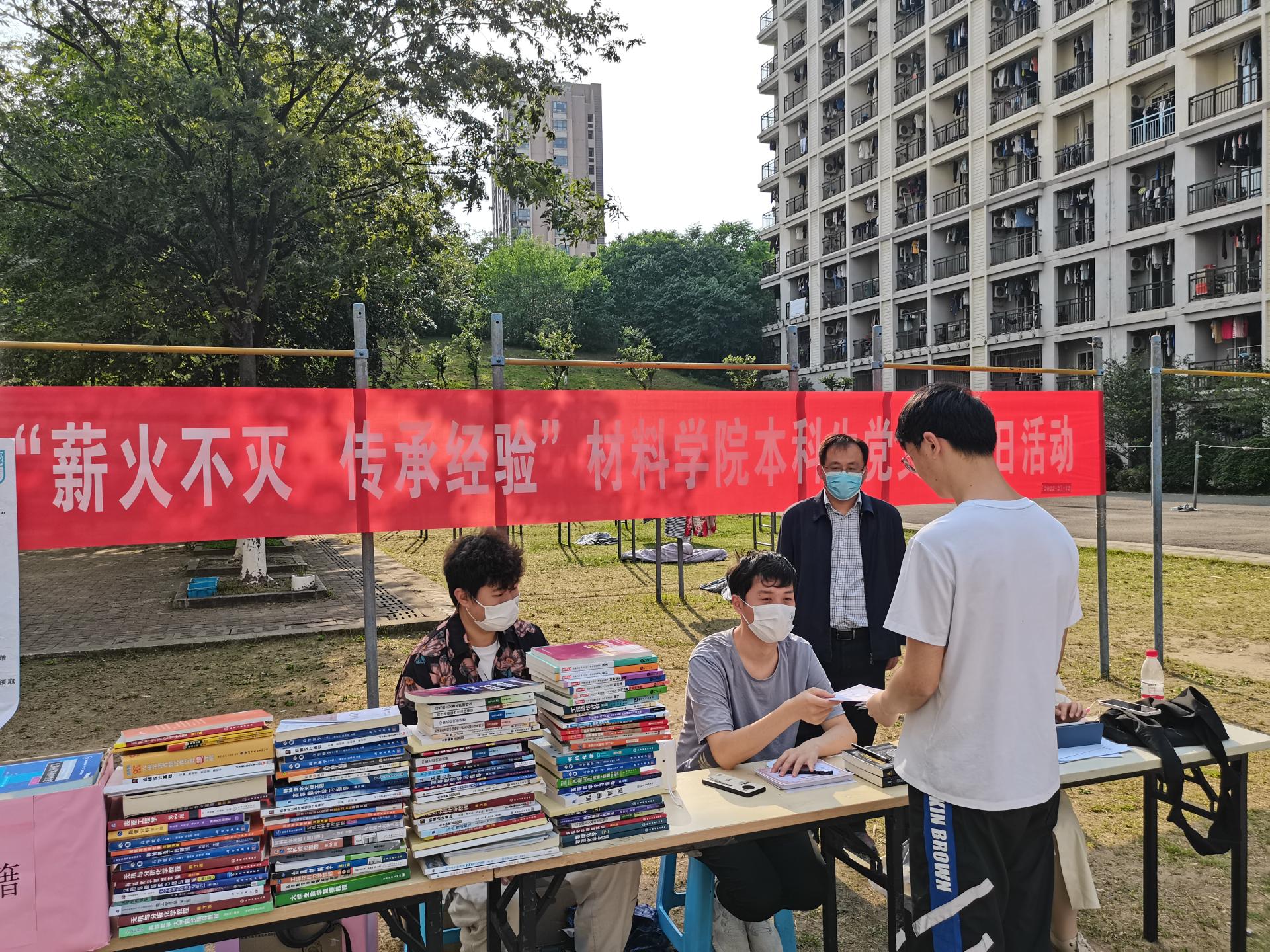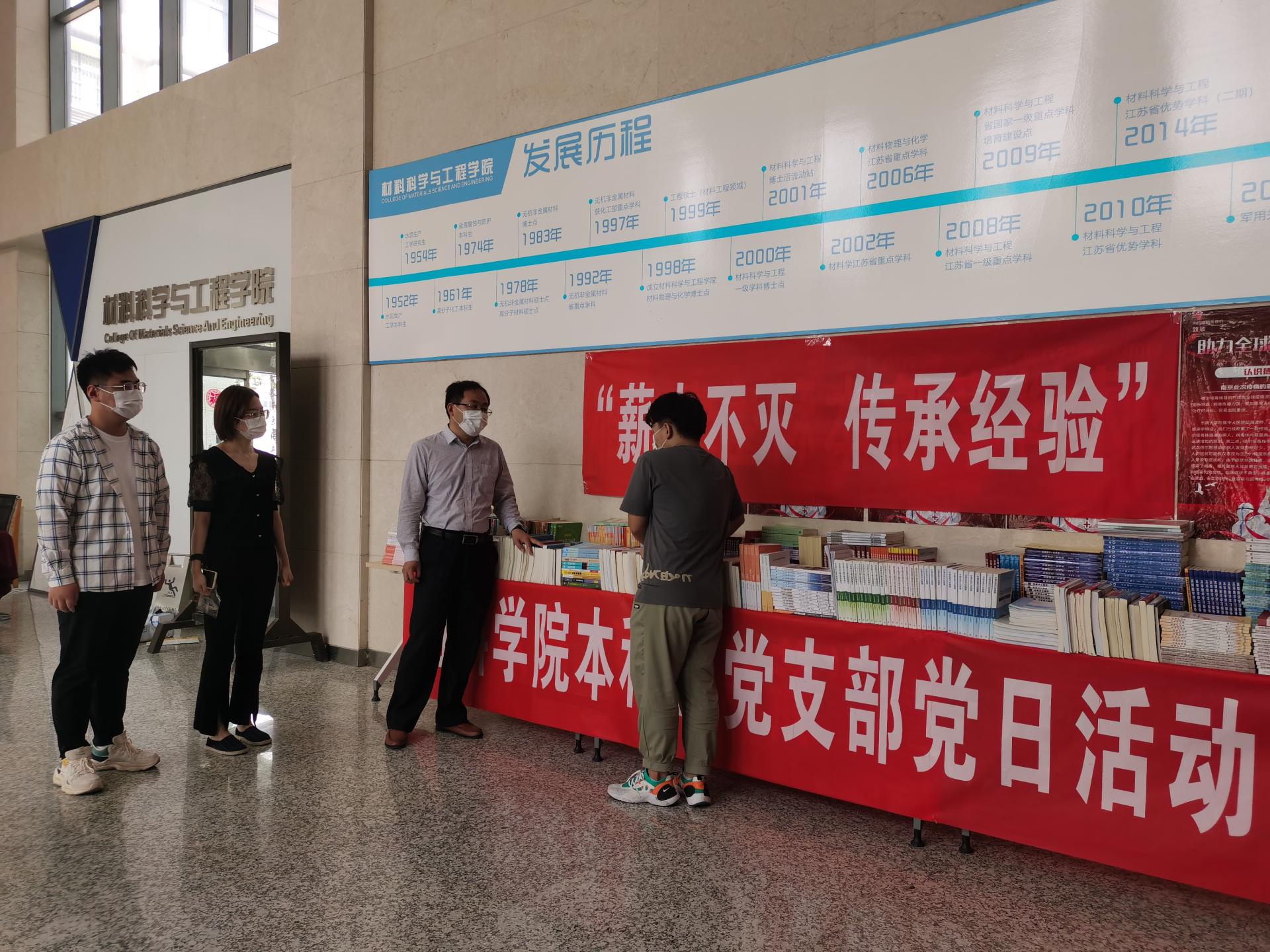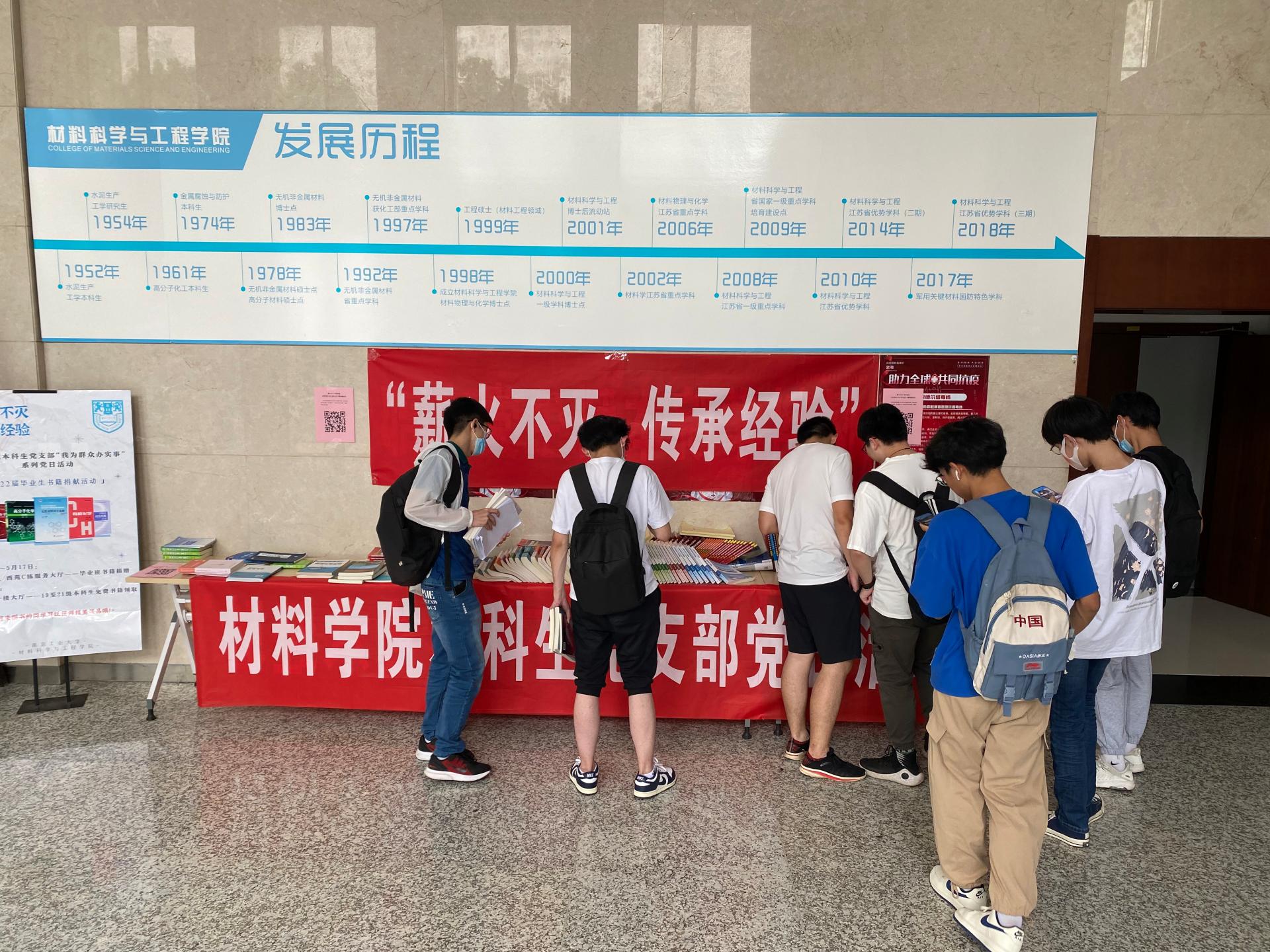5月16日-17日材料学院2022届本科毕业班学生捐赠专业类、考研类和课外阅读类等书籍共500余本。本科生党支部和学生会成员对捐赠者进行信息登记,并向捐赠者发放印有“南工材子”logo的纪念口罩。同时学院老师和学生党员也积极参与,将捐赠的书籍进行筛选、按类整理。5月18日百余名非毕业班学生纷纷前往润德楼A楼大厅领取书籍,填写调查问卷。让学生体会“赠人玫瑰,手有余香”的同时,也为促进校园学风贡献自己一份力量。