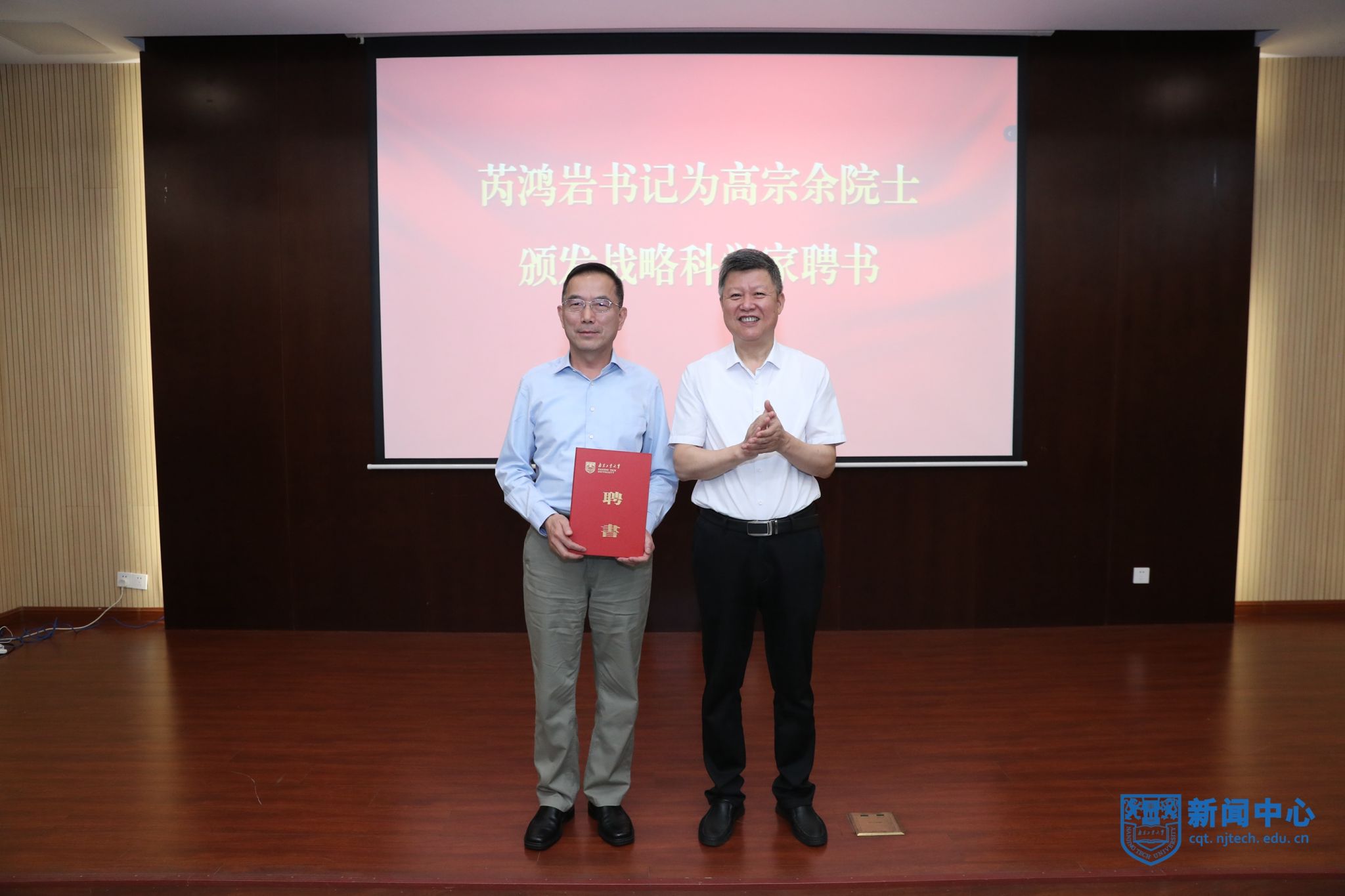 人事处副处长杨洪俊介绍高宗余院士、王仁贵大师、庄勇副总经理的个人简介及主要成就。芮鸿岩书记为高宗余院士颁发战略科学家聘书,为王仁贵大师、庄勇副总经理颁发特聘教授聘书。学生代表为三位专家佩戴校徽并献花。