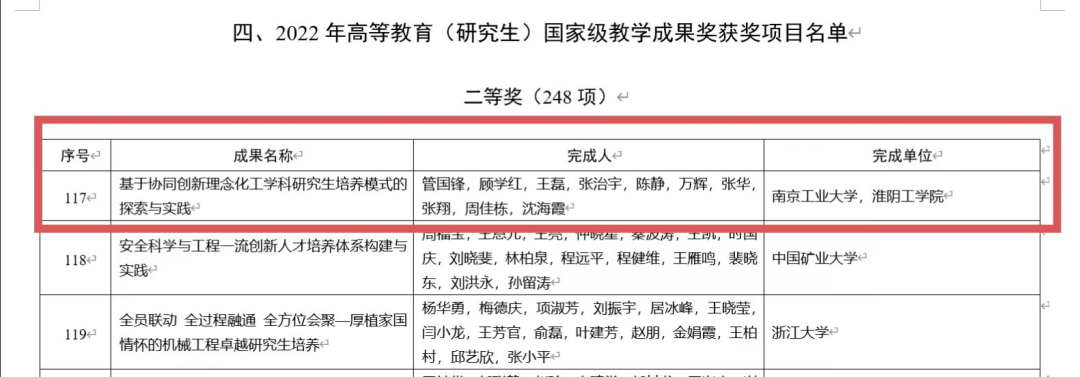 我校管国锋教授领衔主持的教学成果《基于协同创新理念化工学科研究生培养模式的探索与实践》获高等教育(研究生)国家级教学成果奖二等奖。此外,学校教师参与主持本科国家级教学成果奖得一等奖1项、二等奖3项。