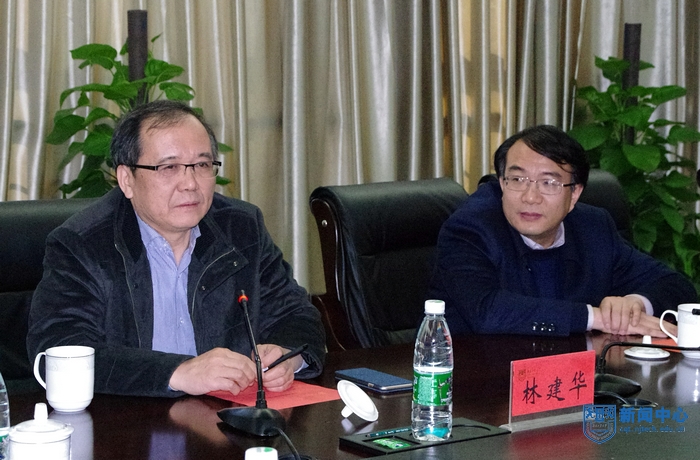 校长黄维院士在座谈会上致辞,对林建华校长一行莅临我校表示热烈欢迎。他盛赞林校长在中国高等教育事业改革和发展过程中作出的突出贡献:在北京大学担任领导期间,耕耘奉献,光耀百年北大精神;主政重庆大学期间,开拓奋进,率领学校快速崛起;掌舵浙江大学至今,奉行“求是创新”,引领“追求卓越”。他指出,林校长作为中国高校的杰出管理者,积累了大量丰富而宝贵的治校经验;作为业内顶尖科学家,为我国在新型无机固体化合物领域的科研工作领军学界奠定了坚实基础。林校长此次造访南工,必将对我校未来发展,尤其是“十三五”规划的制订带来先进的管理理念和发展战略,对南工的长远和可持续发展具有非常重要的指导意义。黄校长介绍了南工以成为国家首批入选“高等学校创新能力提升计划(2011计划)”14所高校之一为契机,围绕事关学校发展全局的重点领域和关键环节全面实施“八大工程”,系统打造“协同创新、人才引育、文化引领”三大体系,锐意进取,跨越发展的相关情况,并着重阐释了学校近期大力引进全球化高端人才、深入挖掘与弘扬时钧院士精神和深度建设海外人才缓冲基地,助力“综合性、研究型、全球化”大学建设的有关工作。