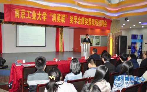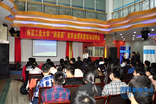 10月17日上午,2014年度“润英联”奖学金颁奖暨现场招聘会在我校江浦校区大学生活动中心举行。润英联(中国)有限公司总经理Wui Kar Soon先生,中国区人力资源经理严菁玲女士,中国区人才顾问瞿璐扬女士,润英联公司优秀员工、我校14届毕业生朱晓飞先生莅临出席,我校学生处处长郭万牛,研究生院思政与管理办公室主任顾永东与化工学院党委副书记弋鹏参加了颁奖仪式。仪式由学生处副处长潘运军主持。