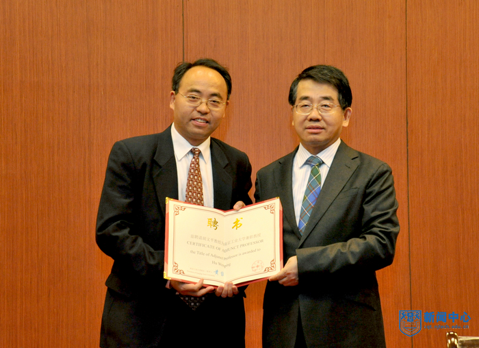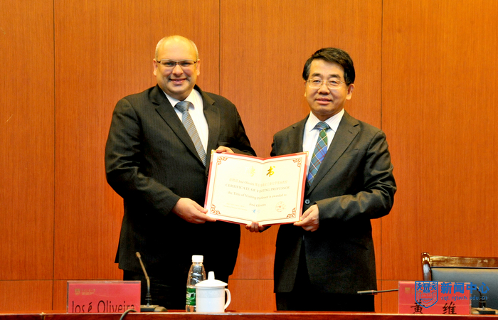 简短而隆重的聘任仪式上,校长黄维院士先后为José Oliveira博士颁发客座教授聘书,为徐东升教授、胡文平研究员颁发兼职教授聘书,并代表全校师生对他们的到来表达了最诚挚的欢迎。学生代表为三位教授佩戴校徽、并献花。