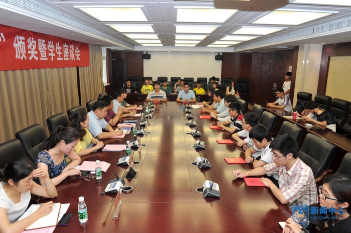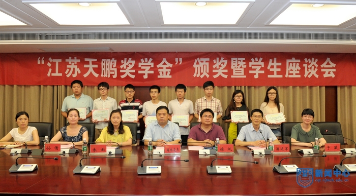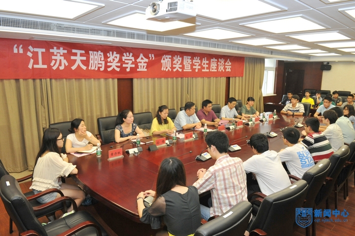 6月24日下午,2013年度“江苏天鹏奖学金”颁奖暨学生座谈会在我校江浦校区行政楼104会议室举行,江苏天鹏石化特种工程有限公司轮值执行总裁徐斌、副总裁端木凌杰、总裁办副主任朱云莅临出席,我校相关学院党委副书记、辅导员、全体获奖学生及学生代表参加会议,活动由学生处副处长潘运军主持。