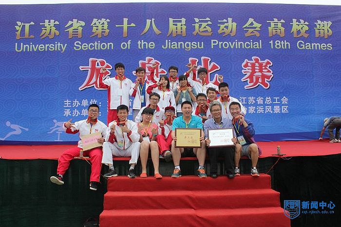由江苏省教育厅、江苏省体育局主办,江苏省学生体育协会高校工作委员会协办、常熟理工学院承办的江苏省第十八届运动会高校部龙舟赛于6月1-2日在常熟市沙家浜风景区举行。省内20所高校(其中本科院校14所,高职高专院校6所)组队参加了本次比赛,比赛分别设200M直道竞速与500M直道竞速。与我校同分在甲组(本科组)的竞争对手是参加过“中华龙舟大赛”淮海工学院与东南大学,还有具有高水平龙舟队的苏州大学、江南大学、常熟理工学院等院校。我校龙舟队在领队侯桂明副主任,主教练茆登华老师的率领下,获甲组团体总分第三。