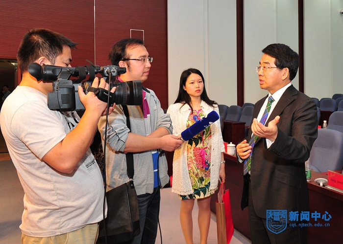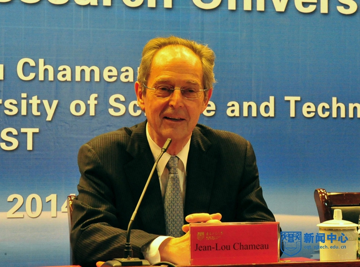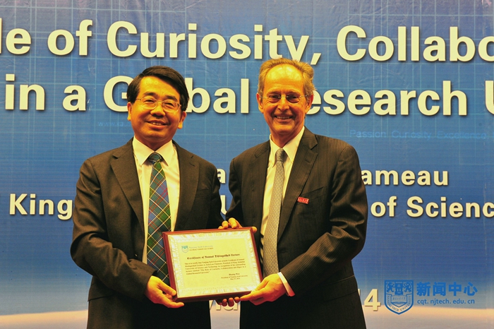 5月19日上午,沙特阿卜杜拉国王科技大学(KAUST)校长Jean-Lou Chameau(让•洛•钱缪)博士名誉教授受聘仪式暨海外名师讲堂在科技创新大楼5楼报告厅隆重举行。校党委书记王德明、校长黄维院士,校党委副书记、纪委书记朱跃钊,副校长乔旭、蒋军成、崔益虎、张进明、巩建鸣、邢卫红出席仪式,受聘仪式由副校长蒋军成主持。全体中层干部和师生代表参加仪式。