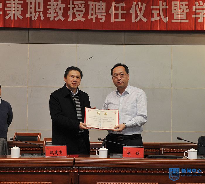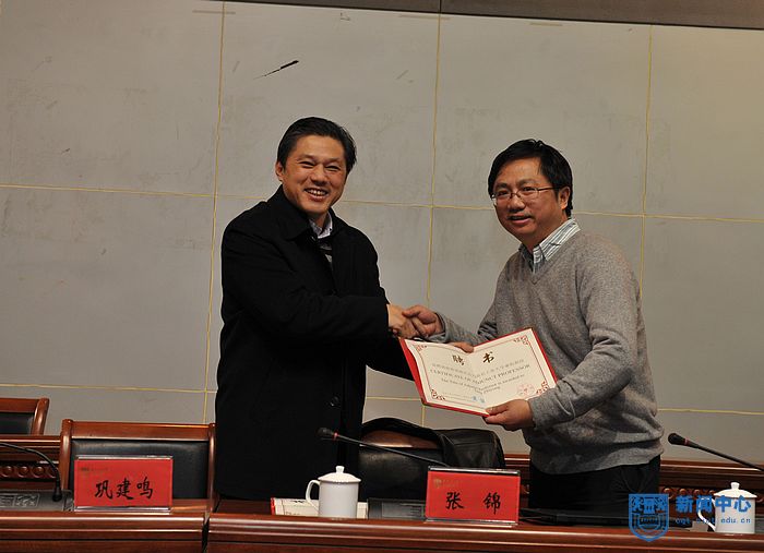 万博官方app下载 部常务副部长刘永福教授介绍了张锦博士、王丹博士、唐智勇博士等三位博士的简历,副校长巩建鸣教授为三位博士颁发兼职教授聘书、并佩戴校徽,学生代表向三位博士献花。