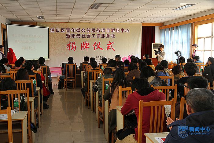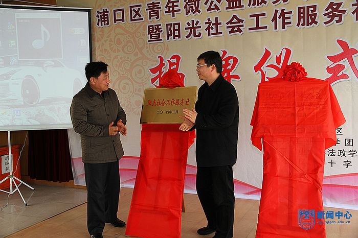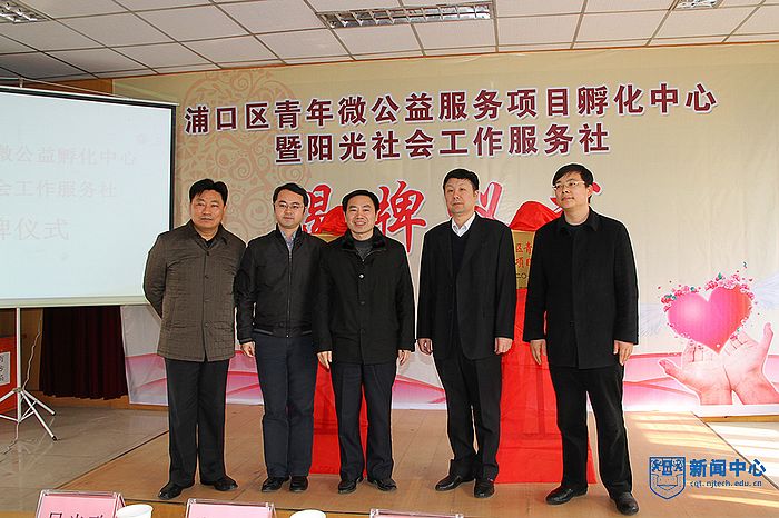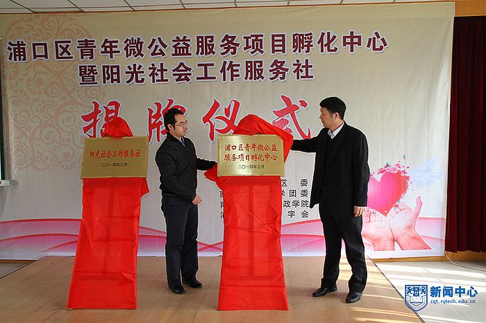 3月5日下午,在全国上下纪念开展向雷锋同志学习活动51周年之际,由校团委、浦口团区委和我校法政学院三方联合举办的青年微公益孵化中心暨阳光社会工作服务社揭牌仪式在浦口青年微公益孵化中心隆重举行。副校长崔益虎教授、省依法治省办公室专职副主任沈国新、团市委书记单晓峰、浦口区副区长吴光政、市司法局副局长陶国中、校团委书记刘大卫、法政学院院长刘小冰、浦口团区委书记郭玉臣,及我校40多名青年志愿者代表参与了此次活动。