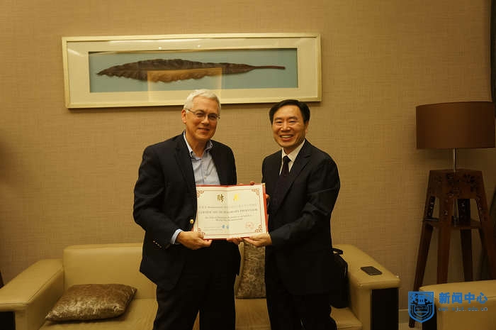 10月6日,北卡州立大学(NCSU)的Phillip Ray Westmoreland教授——AIChE 2013主席受聘我校名誉教授。副校长崔益虎教授,人事处刘永福处长,国际合作处景苏副处长,化学化工学院范益群院长,“973”首席科学家陆小华教授,冯新教授出席聘任仪式。授聘仪式由景苏处长主持。崔益虎副校长为其颁发了名誉教授聘书并致辞。授聘仪式后,副校长崔益虎教授,人事处刘永福处长,国际合作处景苏副处长,化学化工学院范益群院长,陆小华教授,冯新教授与Westmoreland教授洽谈双方今后在科学研究、博士生培养、师生交流、双学位设置等方面可展开多层次全方位的合作意向。