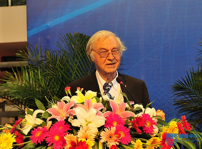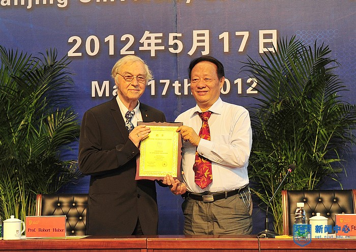在热烈的掌声中,校长欧阳平凯院士向罗伯特•胡贝尔教授颁发了荣誉教授聘书并为他佩戴了南工大校徽,学生代表敬献了鲜花。校长欧阳平凯院士在致辞中简要介绍了我校的历史和办学地位。欧阳校长说,南工大有着美丽的校园、坚持创办创业创新型大学的方向、顶天立地的学科和科学研究实践和培养创业型学生的人才培养理念等四个特色。他指出,继诺贝尔化学奖获得者阿龙•西查诺瓦教授于2010年受聘我校荣誉教授之后,胡贝尔教授今天的受聘,是我校建设有特色高水平大学的又一重大喜讯,必将为我校吸引更多高层次优秀人才,加速建设世界一流的学科与平台,发挥重要的示范作用。