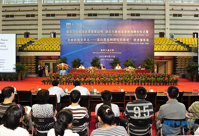 5月17日下午,诺贝尔化学奖获得者罗伯特•胡贝尔荣誉教授聘任仪式暨学术报告会在江浦校区体育馆隆重举行。聘任仪式结束后,胡贝尔教授为我校师生做了一场题为“生命的组成单元——蛋白质结构进化的美学”精彩学术报告。校党委书记王德明,校长欧阳平凯,副校长乔旭、蒋军成,纪委书记崔益虎,副校长张进明等出席聘任仪式并聆听了报告。活动由校党委书记王德明主持。
