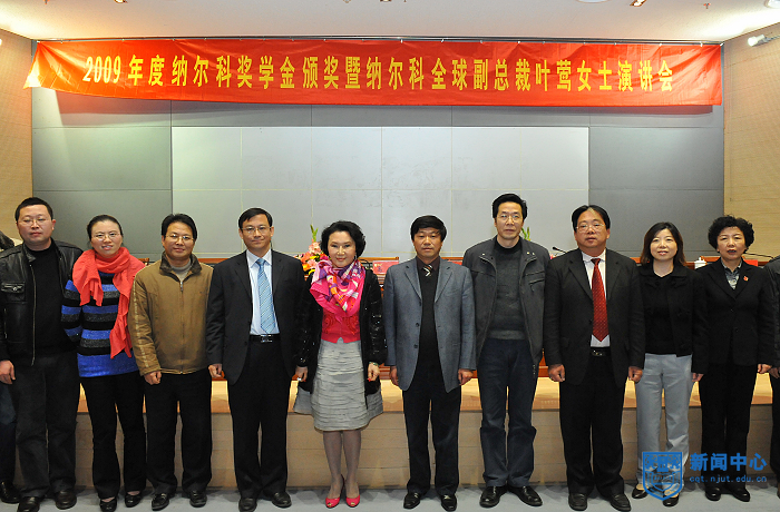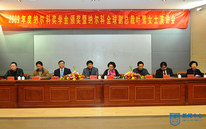 12月2日下午,我校在逸夫图书馆一楼报告厅隆重举行2009年度纳尔科奖学金颁奖暨纳尔科全球副总裁叶莺女士演讲会。纳尔科全球副总裁兼大中华区主席叶莺女士,纳尔科能源部中国区发展经理蔡康煜先生,我校党委副书记、副校长高明,党委宣传部部长郭万牛,党委学工部部长、学生处处长何学军,团委书记童毛弟,国际合作处处长韩鲁平,化工学院院长刘晓勤等出席了活动。活动由化工学院党委副书记鞠永干主持。