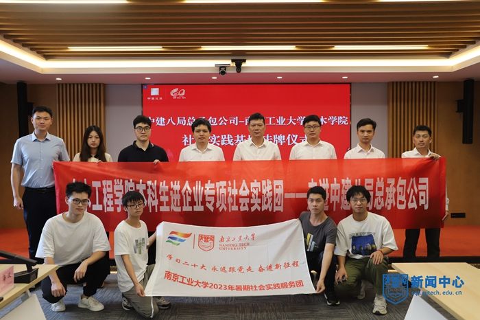 近日,土木工程学院本科生进企业专项社会实践团前往中建八局总承包公司江苏分公司开展暑期社会实践并举行社会实践基地共建签约授牌。中建八局总承包公司江苏分公司党总支副书记张海军、商务法务部经理冯军及相关人员,土木工程学院党委副书记路遥及相关人员、社会实践学生代表等参加活动。