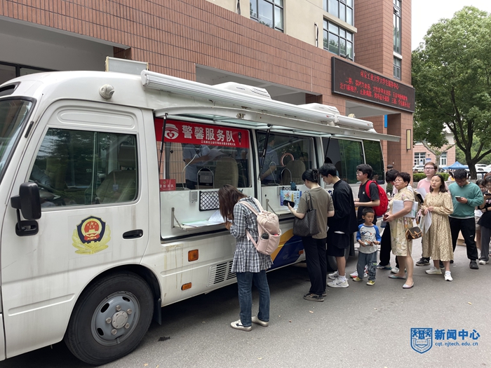 5月14日,江北新区分局政务服务管理大队长施逸一行来校,保卫处副处长徐东汇报了我校师生员工关心关注的公安政务业务,期望警校双方深化联动,建立长效合作机制。5月21日,江北新区分局政务服务管理大队流动服务车开进校园搭建“绿色通道”,师生员工足不出校即可办理身份证、车驾管和出入境等16项业务,实现一次办、网上办、就近办。叶江山和张峰林警官还结合当前高校师生高发的诈骗类型,针对性地开展反电诈宣传。此次现场办理咨询公安政务业务200余人次,获得一致好评。