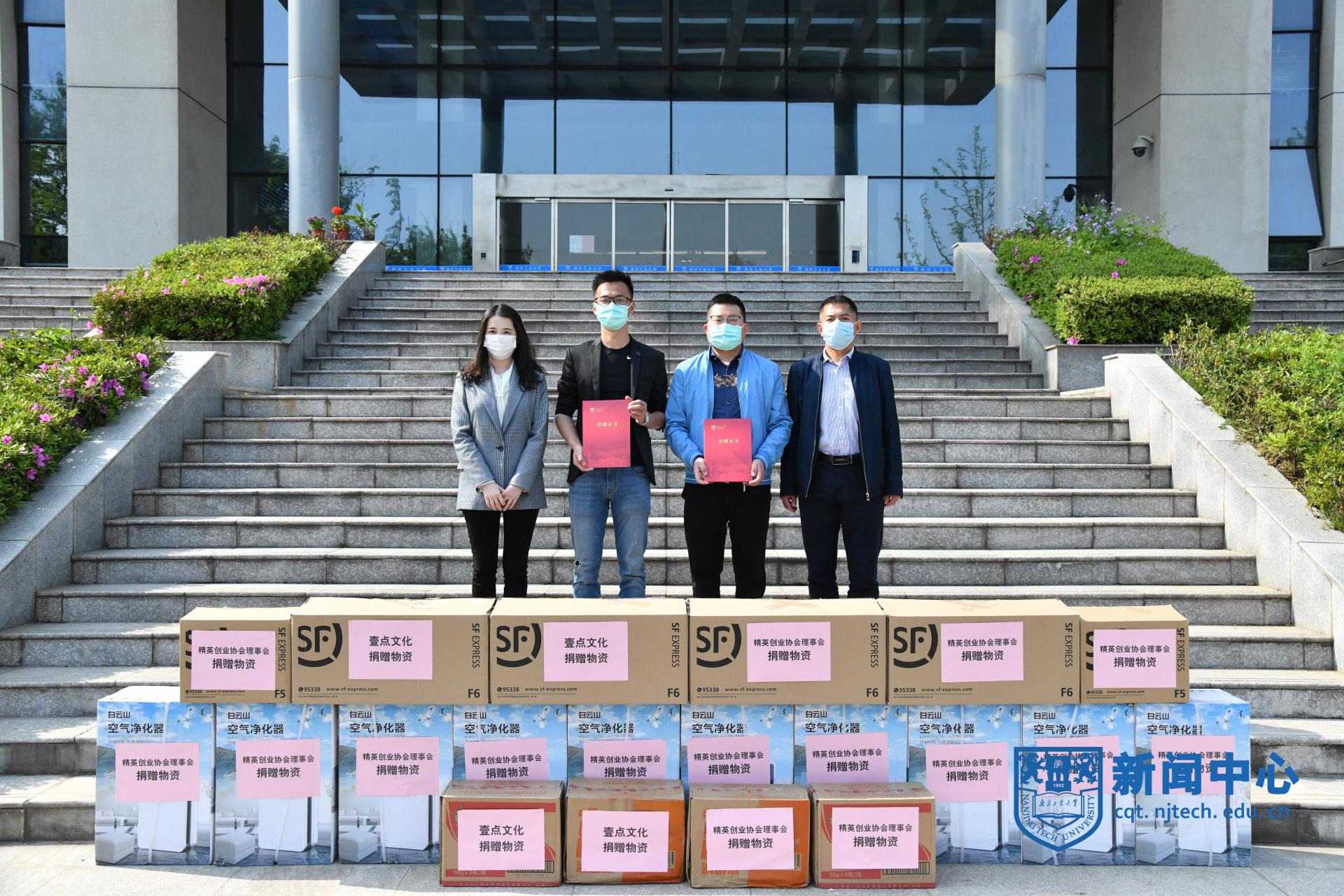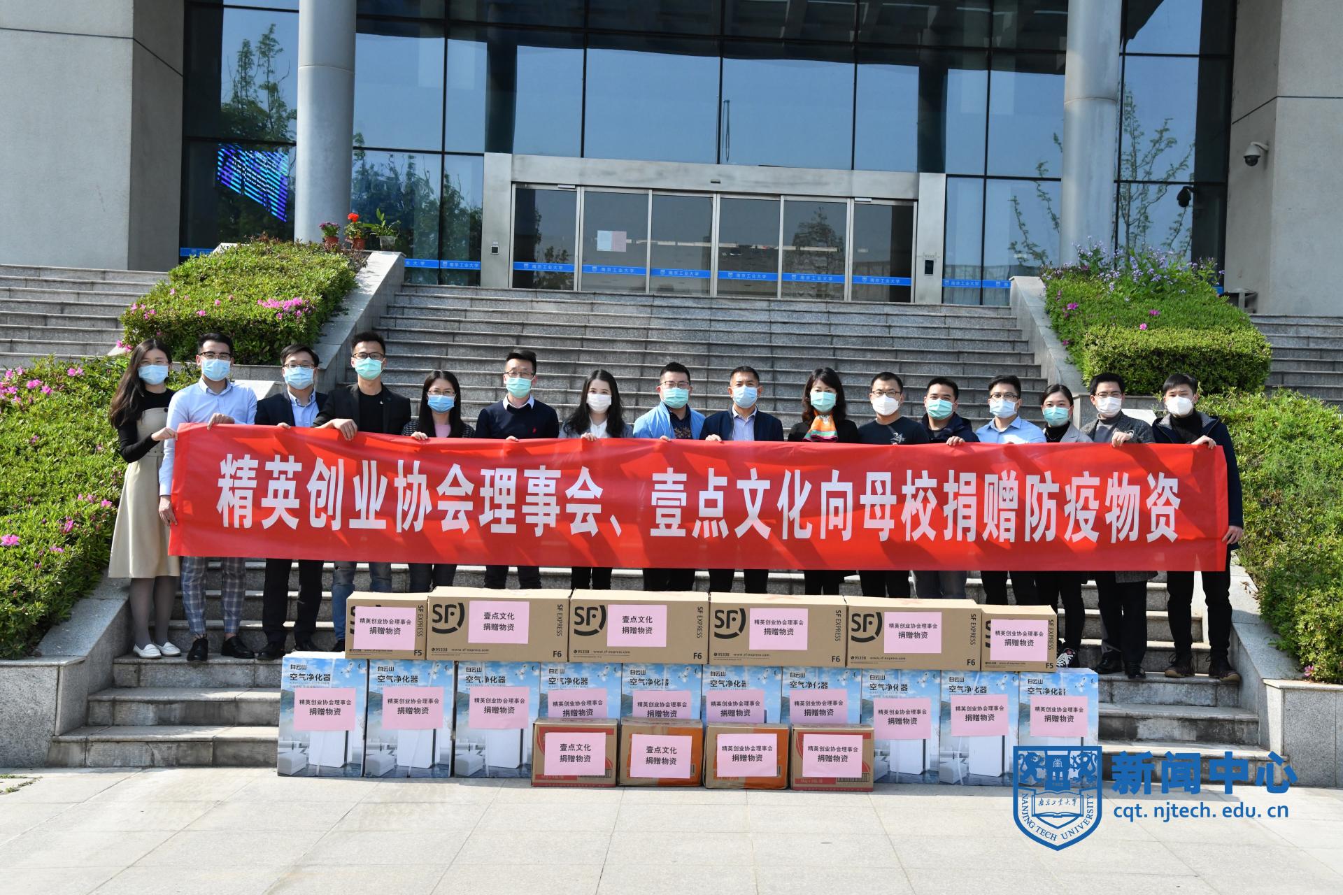 4月9日下午,校大学生精英创业协会及南京壹点绿色文化传播有限公司校友向母校捐赠空气净化器10台、口罩3000只、消毒液5箱等防疫物资,助力我校开学后疫情防控。