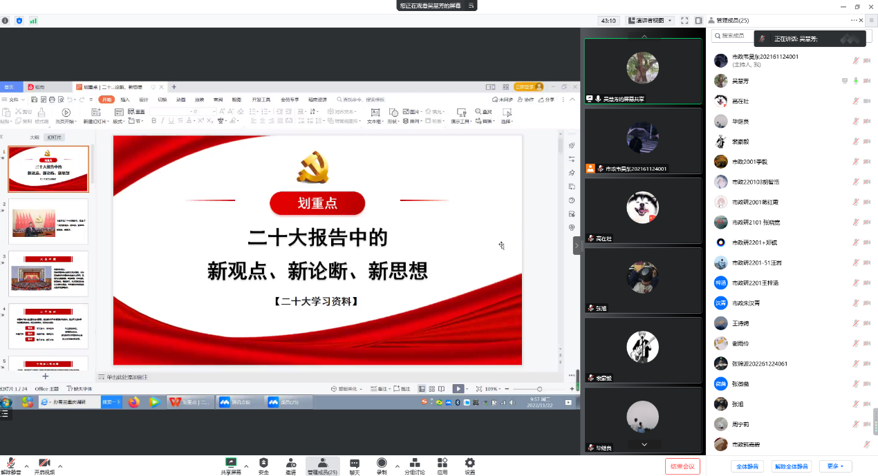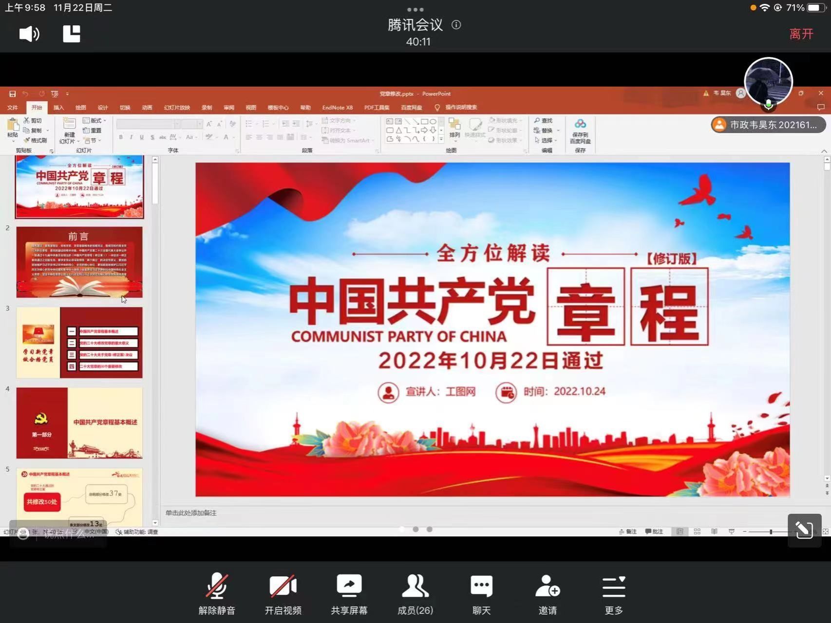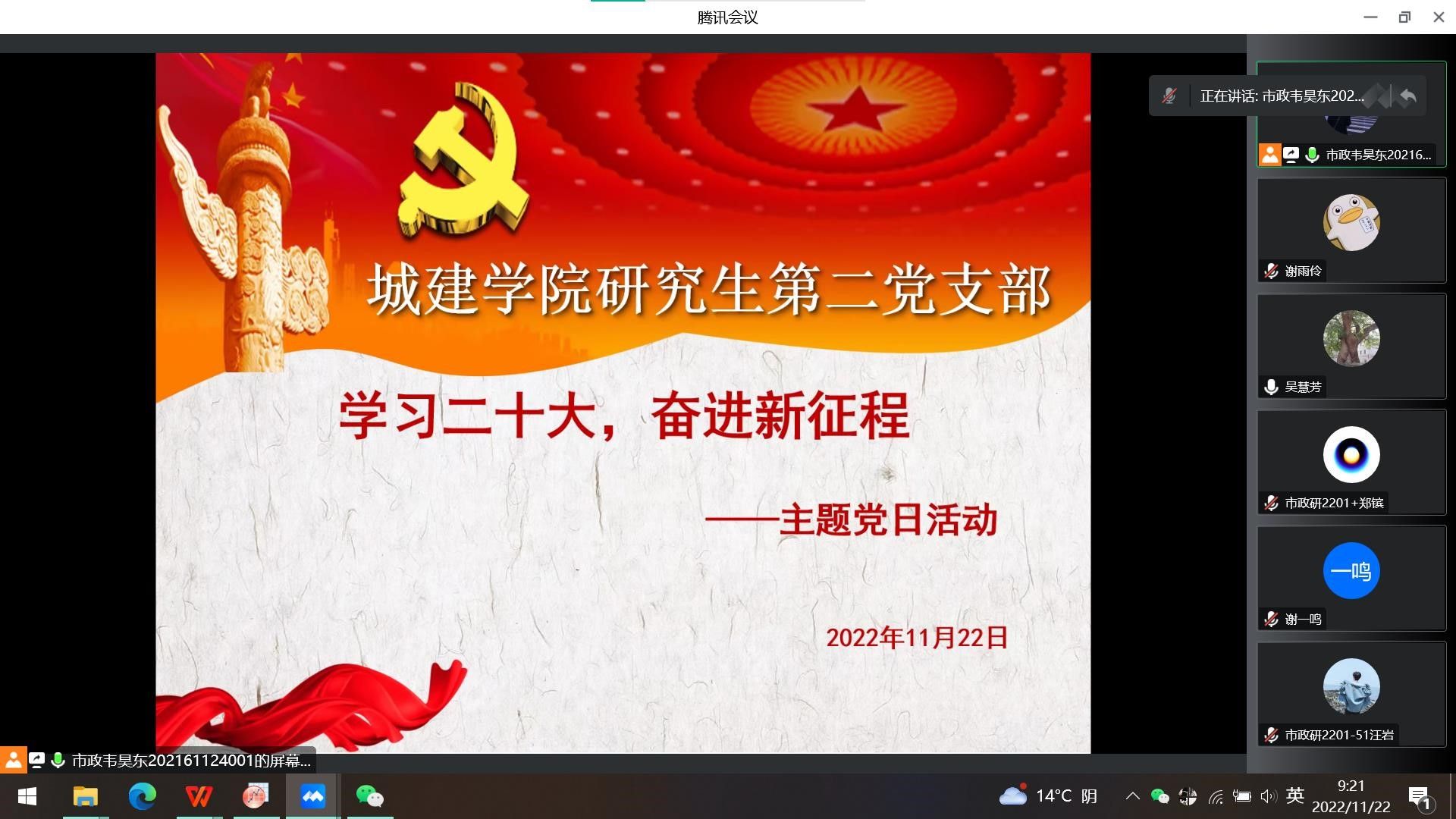 城市建设学院市政研究生党支部于11月22日举行在线会议,学习党的二十大报告和大会通过的《中国共产党章程(修正案)》,激励支部党员增强政治自觉思想自觉行动自觉,把思想和行动统一到党的二十大精神上来。本次活动支部全体党员参加。