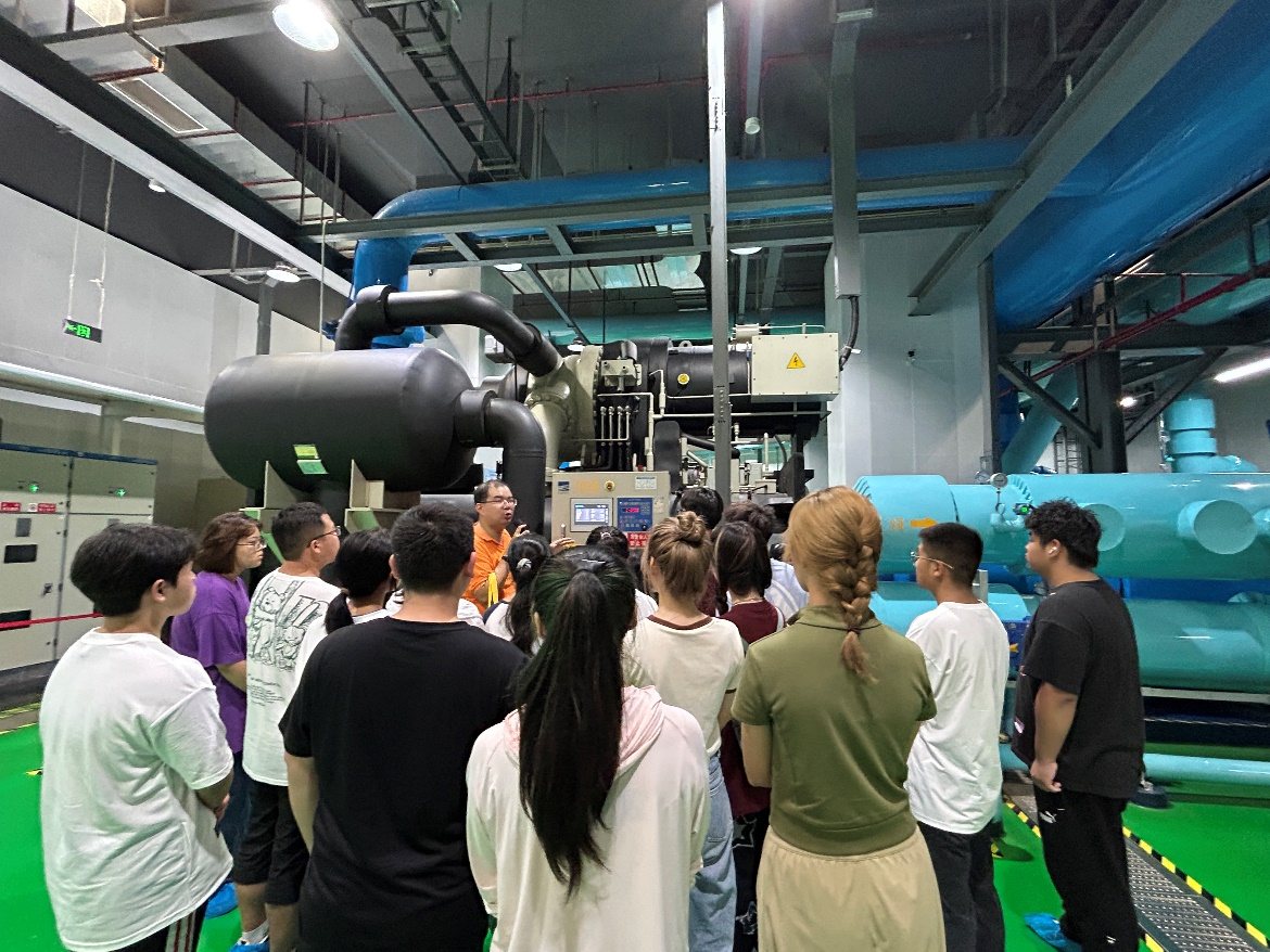 在能源站展厅中,江北公用集团讲解员向大家讲解了江水源热泵的运行原理和其经济、社会效益,激发了大家对利用江水自然冷源的兴趣。在能源站设备区,同学们直观地看到运行中的热泵设备,真切感受到热泵的构造,在老师的讲解下理解了热泵系统和家用空调的异同。设备区还陈列着江北发展规划图和双碳目标,让同学们进一步明白了建环专业的社会价值。