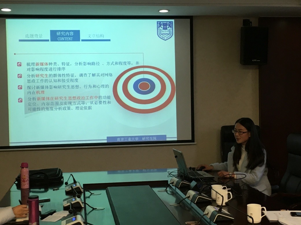 六位研究生辅导员分别就各自申请的2016年度校党建和思政项目的选题背景、研究内容、研究目标、研究重点等方面进行了汇报,高书记和张部长在听取汇报的基础上进行了点评,就如何开展好后续研究提出了具体、建设性的意见和建议。高书记还就如何做好研究生辅导员工作、如何实现自我发展、如何对工作进行宏观思考、如何把握研究生的特点开展有针对性的研究等方面和研究生辅导员们分享了自己的体会。
