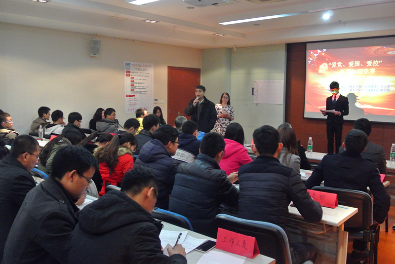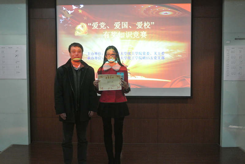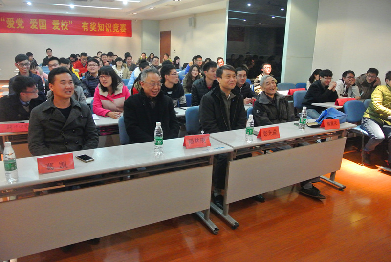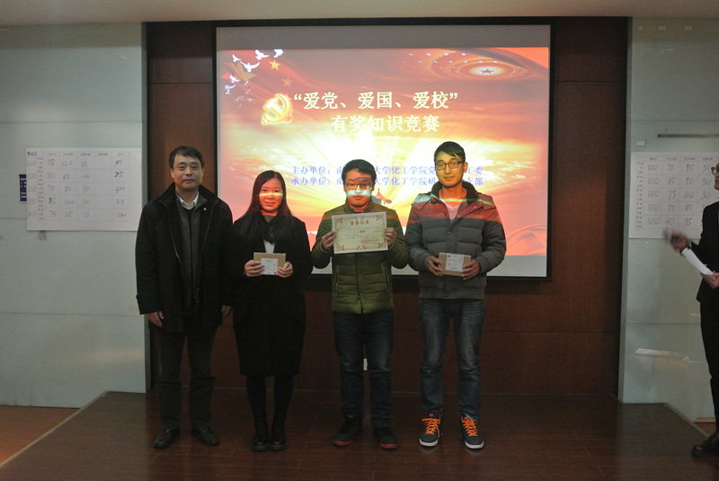 为培育和践行社会主义核心价值观,增进广大研究生对党史、国情、校情的了解,促进研究生万博手机版官网登录网页 建设,丰富研究生课余文化生活,促进班级之间的交流与联系。11月28日,由化工学院党委、关工委主办,研15五党支部承办的“爱党、爱国、爱校”有奖知识竞赛活动在丁家桥校区创新大楼A506成功举办。化工学院党委书记、关工委主任彭光成、关工委副主任潘林庚、秦重庆和辅导员员葛凯出席。