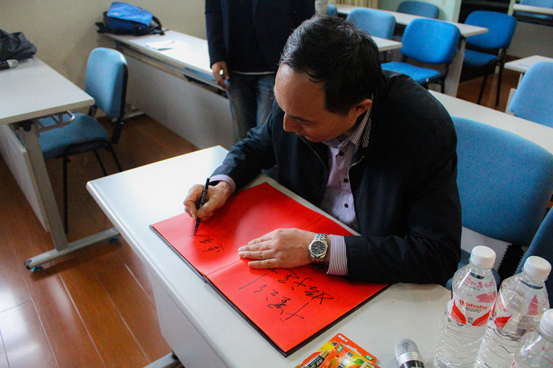 在互动提问环节,金老师一一回答了同学们的问题。针对目前如何在诸多科研方法中更有效的抓住科研思路,金老师认为现在是信息化时代,学生要关注课题的最前沿,静下心来,脚踏实地,要经得住诱惑,合理利用现代科技,不要沉迷于手机。活动最后,金老师为本次活动题词:追求梦想,坚持实干。