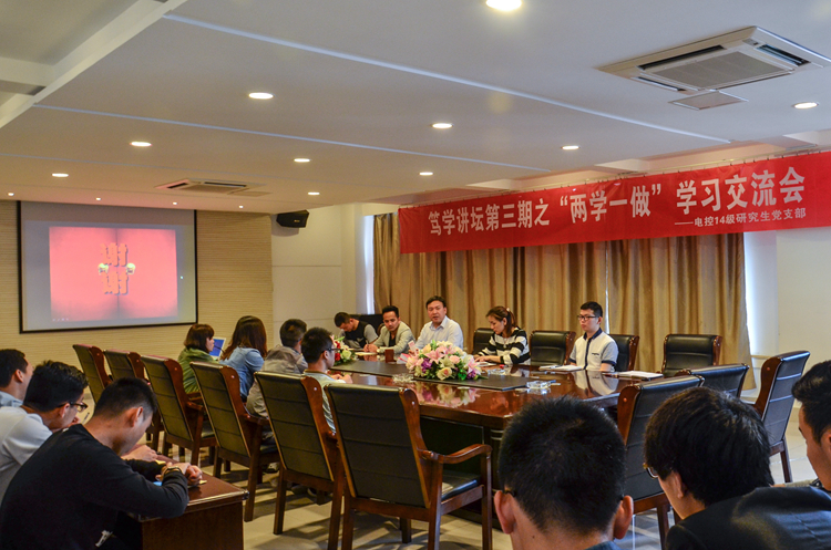 5月25日上午,电气工程与控制科学学院研究生开展了第三期 “笃学讲坛”活动。此次讲坛由14级研究生党支部在院D416会议室进行了“两学一做”微党课交流会,交流会由5位研究生同学分享他们的学习报告,同时集中学习讨论了南京航空航天大学能源学院副书记徐川的“我为什么加入中国共产党”的文章,进一步重温入党启蒙、入党动机教育。学院党委书记黄锁明、研究生辅导员王巧云、全体14级研究生党员和部分入党积极分子参加了本次学习交流会活动。