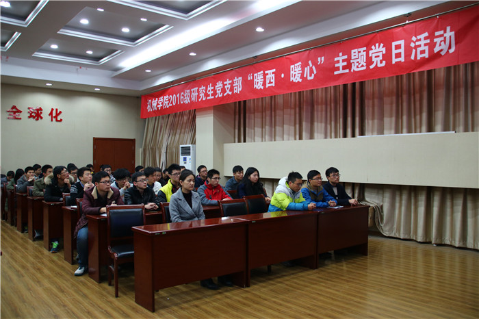 12月1日晚,机械学院2016级研究生党支部“暖西·暖心”主题党日活动于机械E楼报告厅隆重举行。参加活动的有机械学院党委书记戴宏老师、研究生辅导员王巧云老师和2016级研究生党支部全体党员。