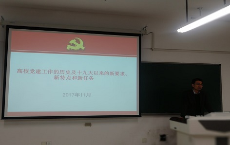 2017年11月27日,在厚学105,安全学院副院长潘勇教授讲授“高校党建工作的历史及十九大以来的新要求、新特点和新任务”专题党课,学院硕士研究生第二党支部和博士研究生党支部全体党员参加学习。