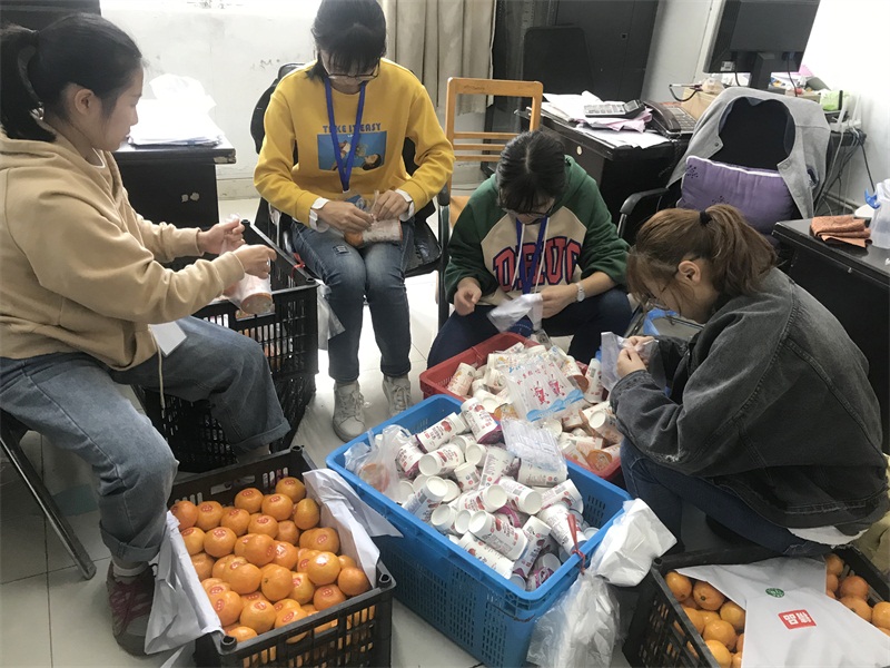 一切准备好后,首先我被安排到装配水果酸奶小组,我和同学们都撸起袖子加油干起来,230份,我们几个同学装完后已经有点小累。再看到一旁,1300份早已被阿姨们装配完成,摆放到位。她们却还丝毫没有累意,我脸红红的心生敬意地看着她们。