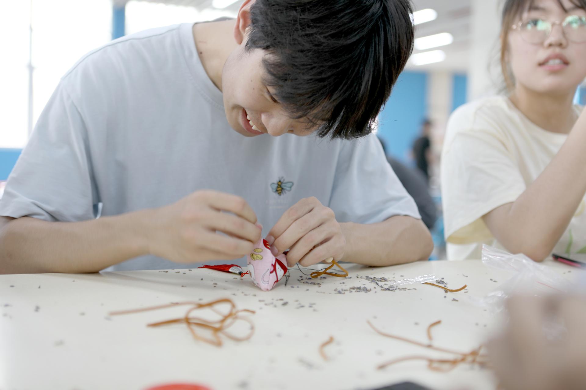 在活动现场,除了有包粽子体验区,还开设了编织手绳、缝制香囊的体验区。打结、串珠、装香、粘贴,不一会儿一个香囊就完成了,制作香囊的各种中药材散发出的天然香气,伴随着同学们手中针线,亲身体验传统手工民俗的风情并探索感知背后的意义。在节日浓浓的氛围之中感受传统文化魅力,也促进了食堂与师生们之间的沟通。