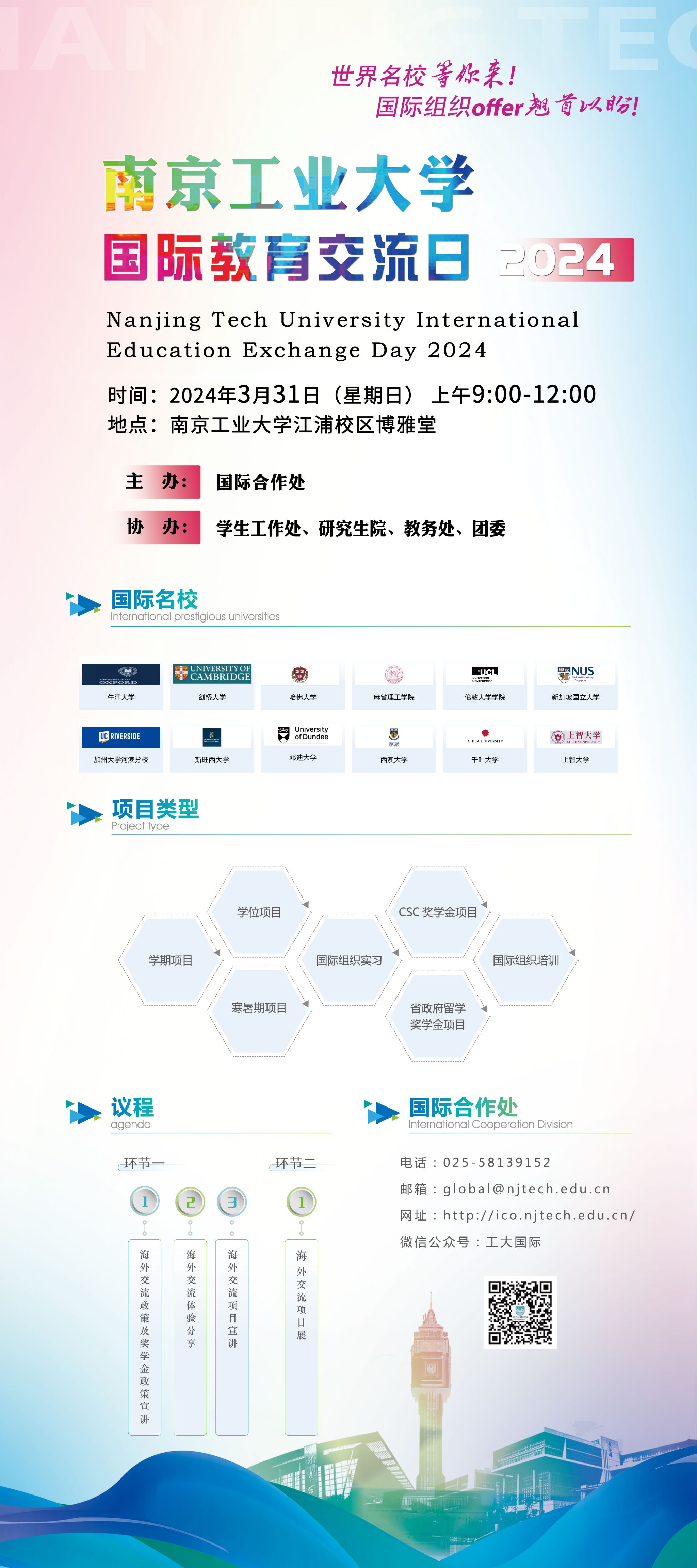 本次活动由国际合作处主办,学生工作处、研究生院、教务处和团委等部门协办,面向全校师生宣讲国家留学基金资助出国项目,江苏省留学基金资助出国项目,海外交流学位项目、学期项目、寒暑期项目,国际胜任力培养与国际组织实习项目的情况及奖学金政策;往届项目学生现场分享精彩的海外交流体验;届时有剑桥大学、牛津大学、哈佛大学等十余所国际知名高校、联合国驻日内瓦总部实地访学等项目现场宣讲和布展,期待大家的到来!