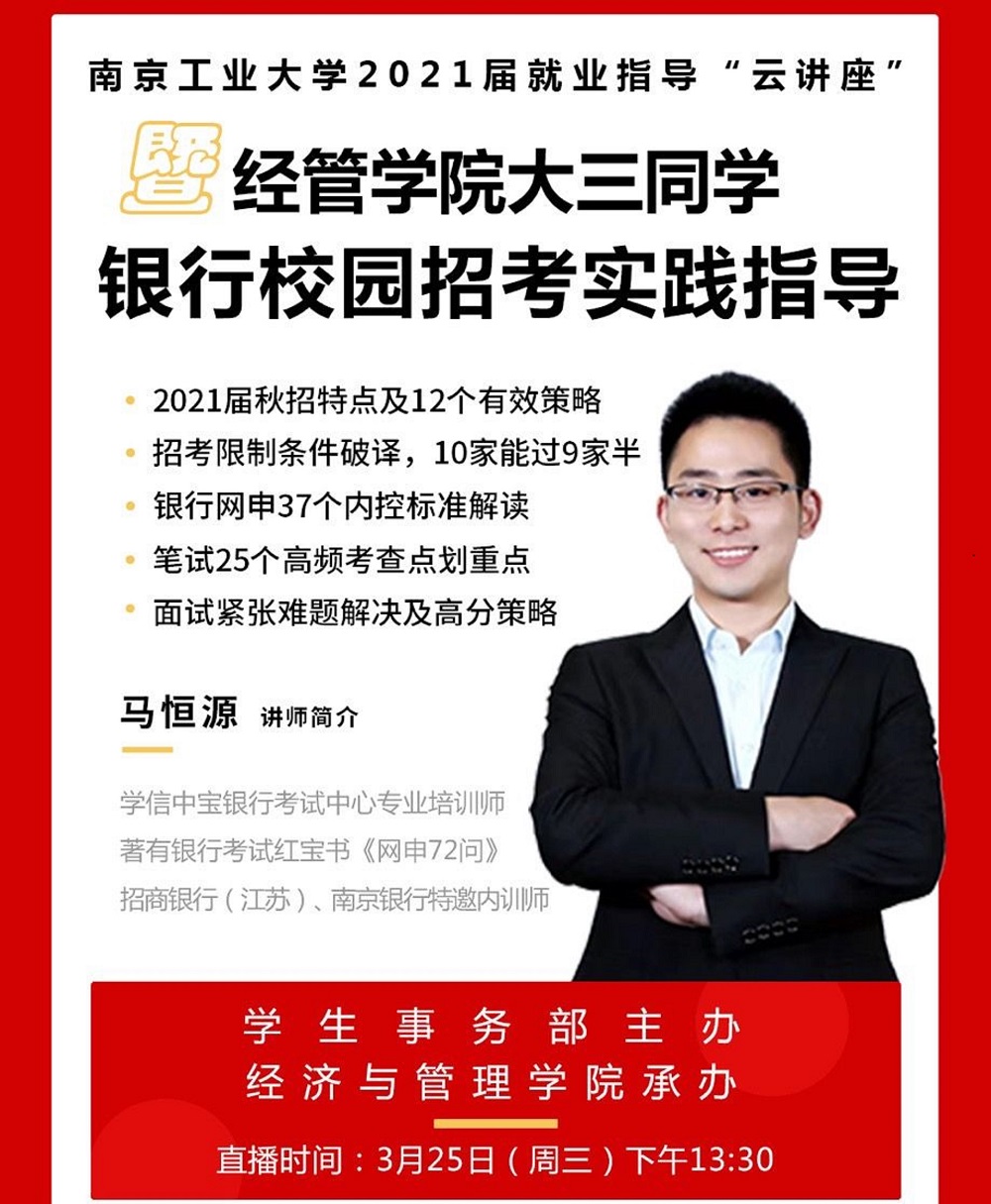 为进一步做好疫情防控期间2021届毕业生就业指导工作,引导学生了解疫情之下的就业形势,树立正确就业观念,积极做好求职准备。现由万博体育bet 学生事务部主办,经济与管理学院承办的“2021届毕业生银行校园招考实践指导”云讲座于2020年3月25日下午13时30分举行。本次讲座邀请学信银行考试中心马恒源老师作主讲嘉宾,2021届毕业班辅导员周洋、田静、李炜程老师及2017级的本科生参加,共计1116人次参与培训。