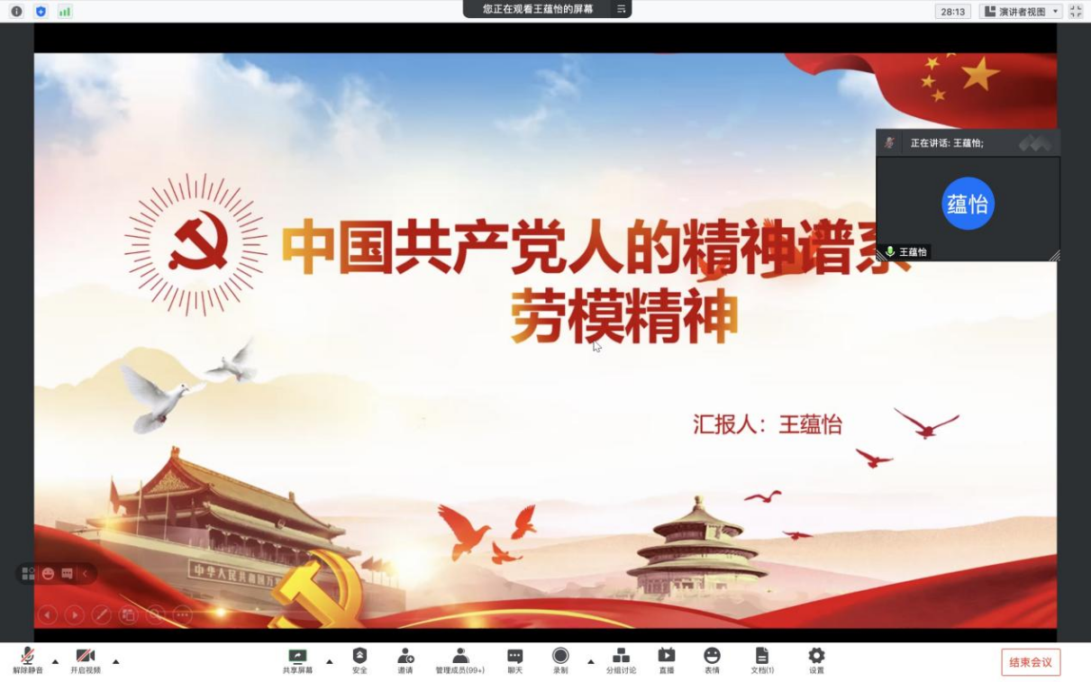 王蕴怡同学与大家分享了“爱岗敬业,争创一流;艰苦奋斗,勇于创新;淡泊名利,甘于奉献”的劳模精神。劳动模范是民族的精英、人民的楷模、共和国的功臣。青年大学生要懂得劳动最光荣、劳动最崇高、劳动最伟大、劳动最美丽的道理,号召全体党员要传承弘扬劳模精神,做知行合一的优秀大学生。