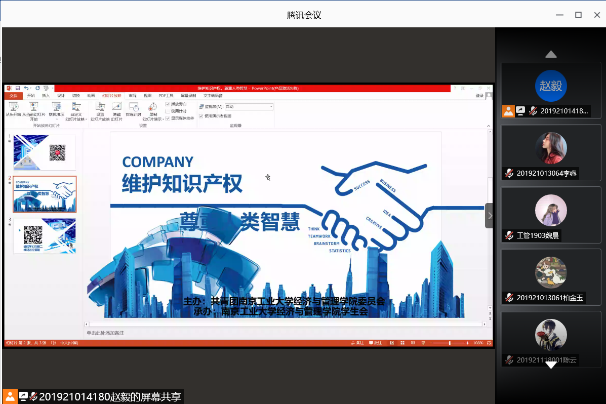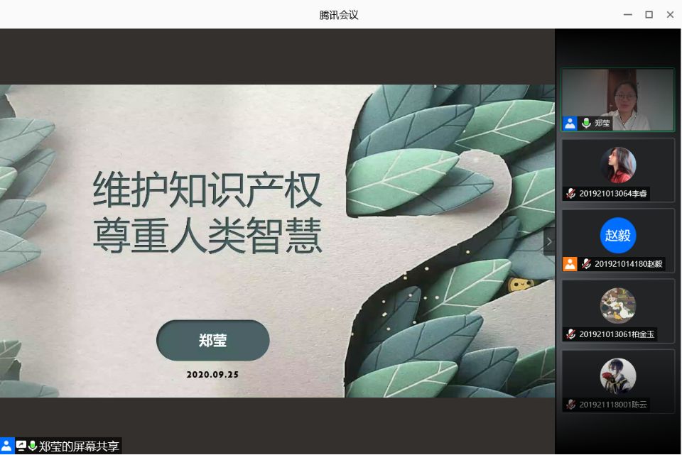 知识产权与我们每个人的生活息息相关,为让同学们认识到知识产权的重要性以及了解如何维护知识产权,经济与管理学院于9月25日晚通过“腾讯会议”平台成功举办“维护知识产权,尊重人类智慧”知识产权讲座暨知识竞赛。本次活动由知识产权系主任郑莹老师主讲,全校共299名同学参加。