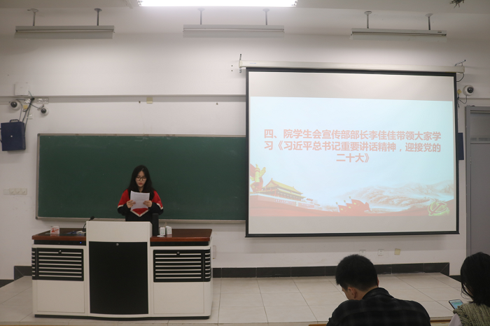 学习会上,院学生会代表袁婷婷带领大家学习《习近平:把中国文明历史研究引向深入 增强历史自觉坚定文化自信》,强调作为青年学生应当成为坚定文化自信的主力军与社会进步、国家发展的重要力量。综合事务部部长周子杨带领大家学习《习近平:新发展阶段贯彻新发展理念必然要求构建新发展格局》,帮助学生了解新发展理念、明确人生目标、鼓励坚持行动与目标一致性。宣传部部长李佳佳带领大家学习《习近平总书记重要讲话精神,迎接党的二十大》,深化学习“两个确立”、“两个维护”、“四个意识”、“四个自信”重要意义,号召同学们在思想武装和实际行动上为迎接党的二十大胜利召开做足充分准备。
