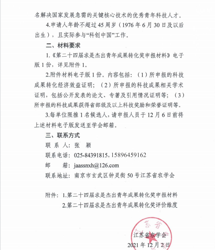 根据《江苏省科协关于提名第二十四届求是杰出青年成果转化奖人选的通知》(苏科协发〔2021〕56号)文件精神,江苏省农学会作为推荐单位,现启动选拔推荐工作,现将有关事项通知如下,具体内容详见附见。请申报人于12月6日上午9点前,将申报材料及附件材料电子版发送至kxsw@njtech.edu.cn.
