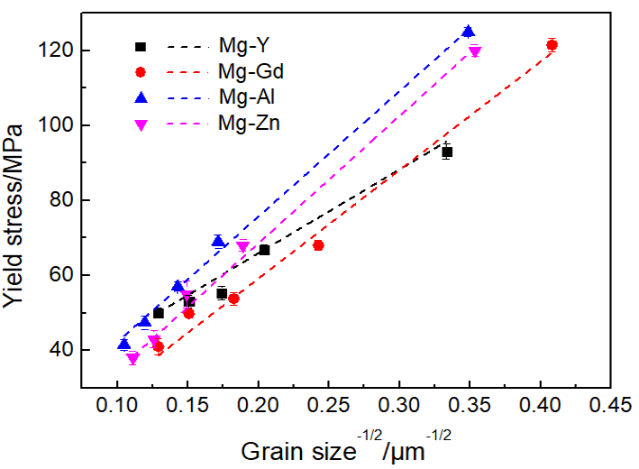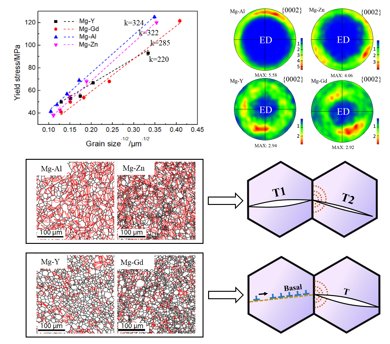 镁合金因其轻质和低密度等优势在汽车工业和航空航天等领域得到了广泛应用,但是低强度是镁合金发展的一大限制。细晶强化是最常用的强化方式之一。细晶强化效果可以用Hall-Petch关系来描述,其中,Hall-Petch斜率k是一个重要的参数,代表晶界对变形从一个晶粒传递到相邻晶粒的阻碍作用的大小。镁合金的Hall-Petch斜率与材料参数密切相关。溶质原子对镁合金的织构和变形模式产生影响,从而影响k值。但是目前,对于不同种类溶质原子对镁合金Hall-Petch斜率的影响规律机制尚未有研究。该论文在镁中分别添加等量(0.35.at%)的Al、Zn、Y、Gd四种溶质原子,挤压得到了Mg-Al、Mg-Zn、Mg-Y、Mg-Gd四种二元镁合金棒材,测试了沿挤压棒材的ED压缩时的Hall-Petch斜率k。研究发现,Mg-Y和Mg-Gd合金的Hall-Petch斜率明显低于Mg-Al和Mg-Zn的Hall-Petch斜率。为了探究其机制,研究者通过定量计算的方法揭示了CRSS比值、织构以及变形模式等影响。研究发现溶质原子可能导致不同变形机制CRSS比值的变化不是导致Hall-Petch斜率溶质原子相关性的主要原因。随后,通过对四种二元镁合金的织构和变形模式进行分析,研究结果表明Zn或Al的加入形成了较强的基相织构,在挤压作用下形成了{10-12}孪晶为主导的变形。相反,Gd或Y的加入使织构弱化,从而使{10-12}孪晶和基面滑移被广泛激活。较低的基面滑移k值和基面滑移对{10-12}孪晶的激活作用,导致Mg-Y和Mg-Gd的k值较低。该成果以题为“Solute atom mediated Hall-Petch relations for magnesium binary alloys”发布在Scripta Materialia上,其中,文钰为论文第一作者,管博为论文的共同第一作者,信运昌教授为论文的通讯作者,黄光杰教授为论文的共同通讯作者。文献链接:https://doi.org/10.1016/j.scriptamat.2021.114451