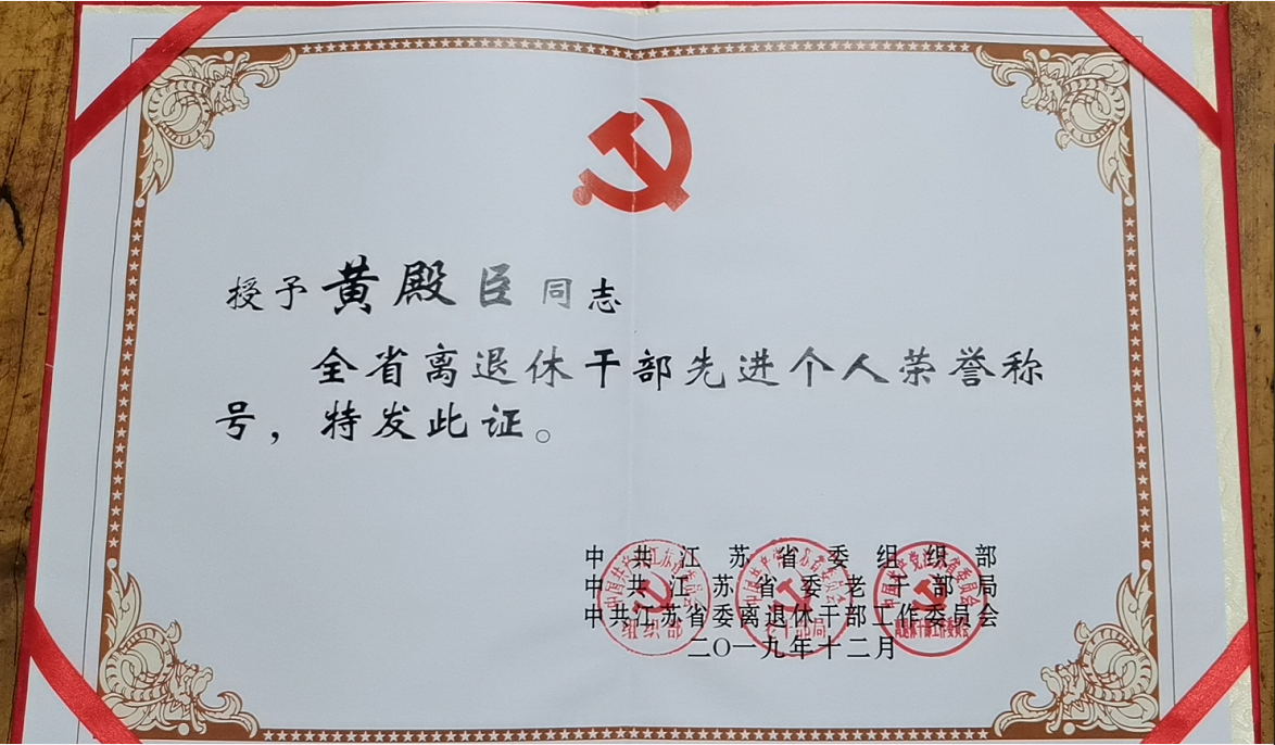4月13日上午,离退休党工委书记阳辉、离退休工作处处长季宜敬走访慰问了退休老领导黄殿臣同志,并为其送上中共江苏省委组织部、中共江苏省委老干部局、中共江苏省委离退休干部工作委员会联合颁发的“全省离退休干部先进个人”荣誉证书。阳书记、季处长向黄老荣获省级先进表示祝贺,对他始终不忘初心、牢记使命,不计名利、甘于奉献,即使离开工作岗位多年,依然信仰坚定、党性坚强,默默无闻地为学校教育事业作贡献表示崇高敬意。