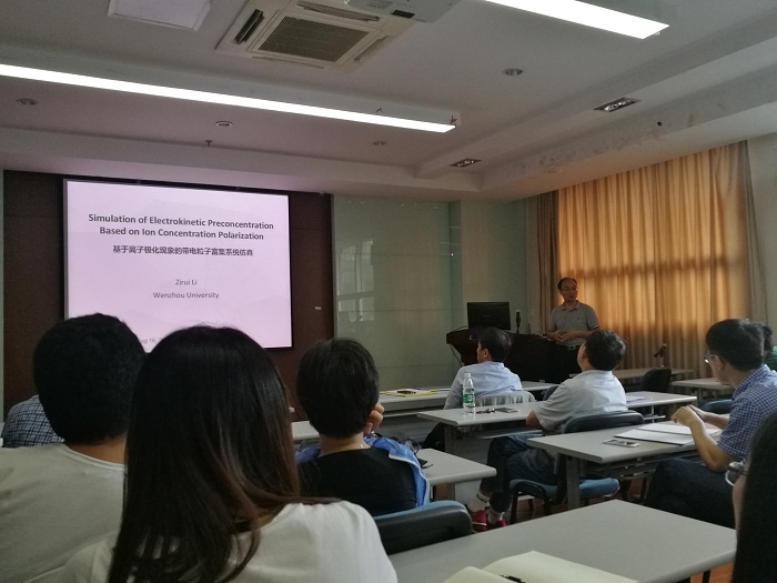 李子瑞教授做了题为“基于离子极化现象的带电粒子富集系统的仿真”的报告。李子瑞教授首先介绍了微纳流体的三个特性:双电层、选择性离子传输和离子浓差极化,还介绍了其一些应用,如脱盐、预富集等,同时指出这些应用中一些不易观察到的现象,而这些现象对于研究来说非常关键,李子瑞教授提出通过模拟的方法,用简化的模型,得到关键的现象。李子瑞教授通过分子模拟的手段对基于离子极化现象的带电粒子富集行为进行了研究,得到了一系列对脱盐等离子分离应用具有重要意义的结论。