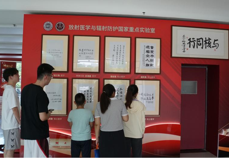 在苏州大学放射医学与辐射防护国家重点实验室“强国有我、与核同行”科学家精神教育基地,同学们在基地志愿者的精致讲解下,从放射医学、辐射防护、血液学等多学科领域了解到核科学技术的前沿与应用,更加深刻体会到了建国初期我国核技术起步、发展的艰难,一代又一代科学家们为此付出的不懈努力。