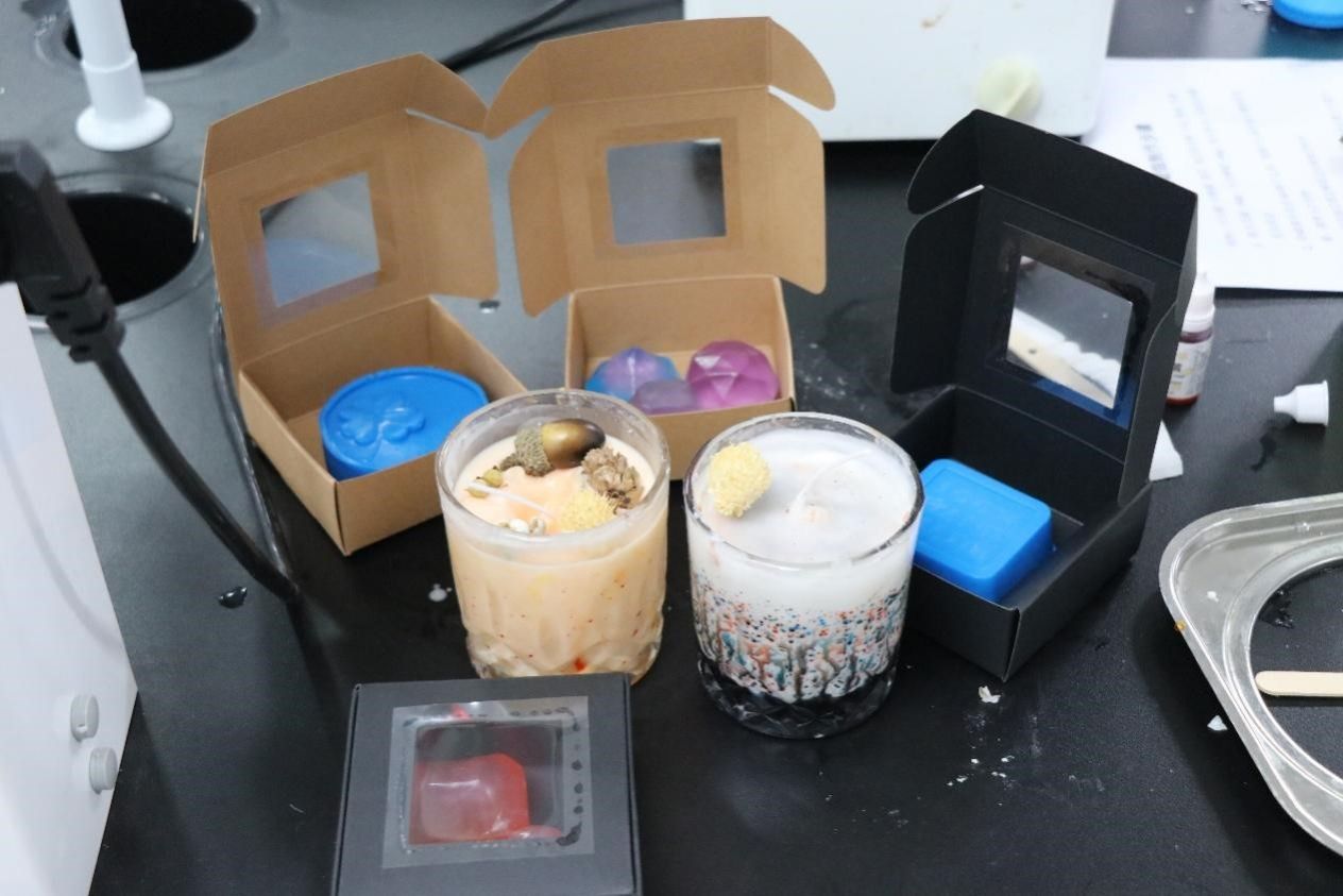 本次“造物集”活动共分为三场,来参加活动的同学们络绎不绝,在学生会工作人员的带领和示范下,同学们了解了配料比例、用料先后以及制作流程等,接着调配实验材料,搭建实验装置,经过一系列的操作与等待,成功制作出了润唇膏、香熏蜡烛以及手工肥皂。活动期间也有不少同学遇到突发状况,在工作人员的帮助下,老师的悉心指导下,同学们积极改进,最终获得成功。