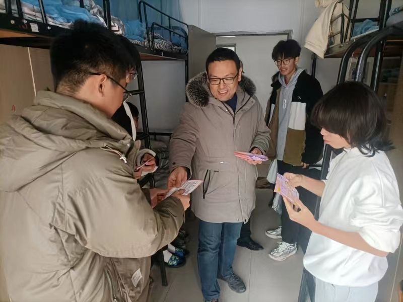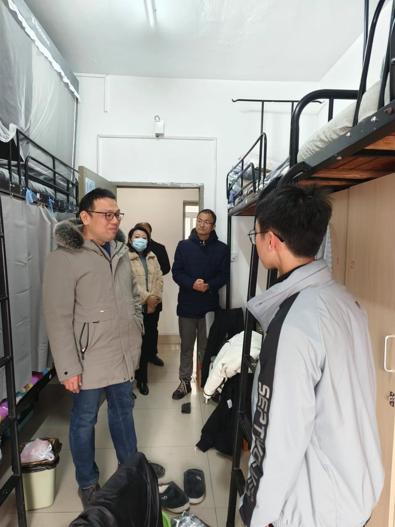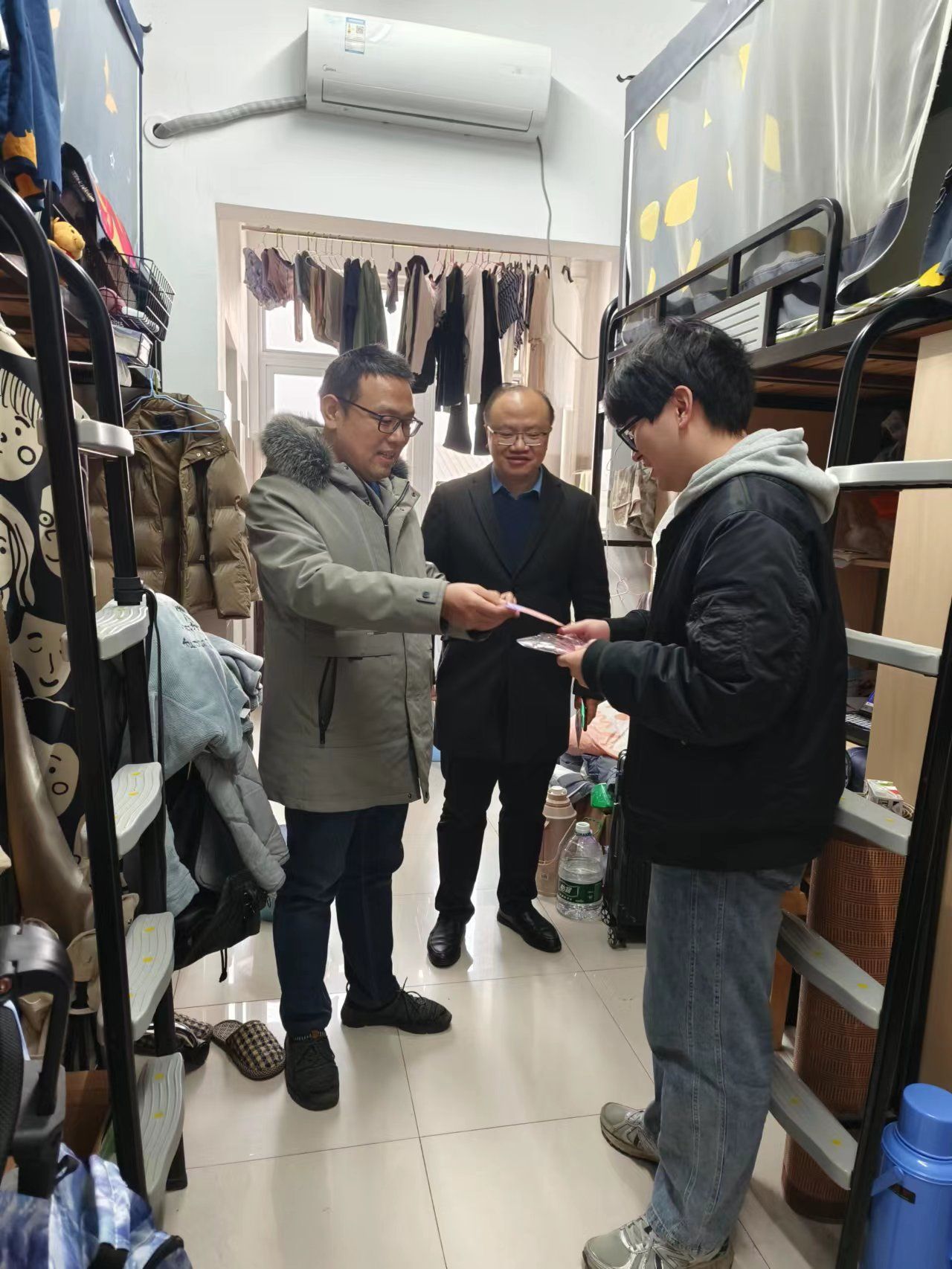 走访中,高振书记带领大家对学生宿舍进行全面安全隐患排查,就新生入学后的学习情况、寒假安排等与同学们深入交流,详细询问了大家在生活和其他方面是否存在困难,希望大家尽快完成身份转变,适应大学学习生活节奏,利用元旦假期做好计划安排,为大学首场期末考试充电蓄能。领导老师们分别走访23级新生和24届毕业班宿舍,亲切询问同学们“宿舍条件是否舒适”、“就业如何考虑”、“考研情况或期末周如何安排”等问题,深入了解学生生活和学习情况,叮嘱大家要加强身体锻炼,注意作息规律,最大可能减少不必要的熬夜,并对家庭经济困难同学送上慰问品。在慰问过程中,领导老师们仔细查看宿舍内务卫生,及时排查安全隐患,对个别问题现象进行现场整改。