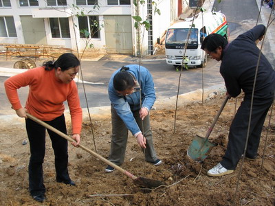 参加此次活动的全院教师和学生党员怀着爱国荣校的情怀,兴致勃勃地挥汗挖坑、植树培土,播种绿色的希望。其中,刘晓宁教授夫妇特地带着留学回国探亲的儿子刘阳、韦萍教授带着上中学的女儿郭晶一起加入义务植树的行列,共同为国家生化中心增添新春的气息。经过两个小时的辛情劳动,大家一共栽下了近300颗冬青树苗。望着亲手栽植的一片冬青树苗,一种奉献之乐、一草一木总关情的感受在大家的心里油然升起。加之劳动之余登上刚刚落成的校园高塔鸟瞰绿树掩映中的江浦校区,更是把大带进了对绿色生态文明校园美好前景的遐想之中。