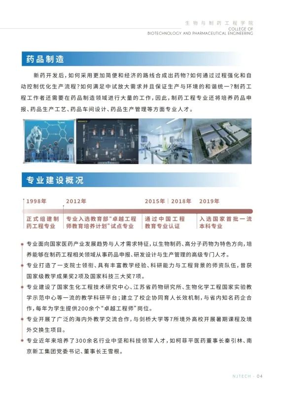 7)专业具有完备的教学与科研平台:国家生化工程技术中心、材料化学工程国家重点实验室、生物化学工程国家级实验教学示范中心、工业生物技术江苏省重点实验室、先进生物制造江苏省工程实验室、江苏省产业技术研究院工业生物技术研究所。
